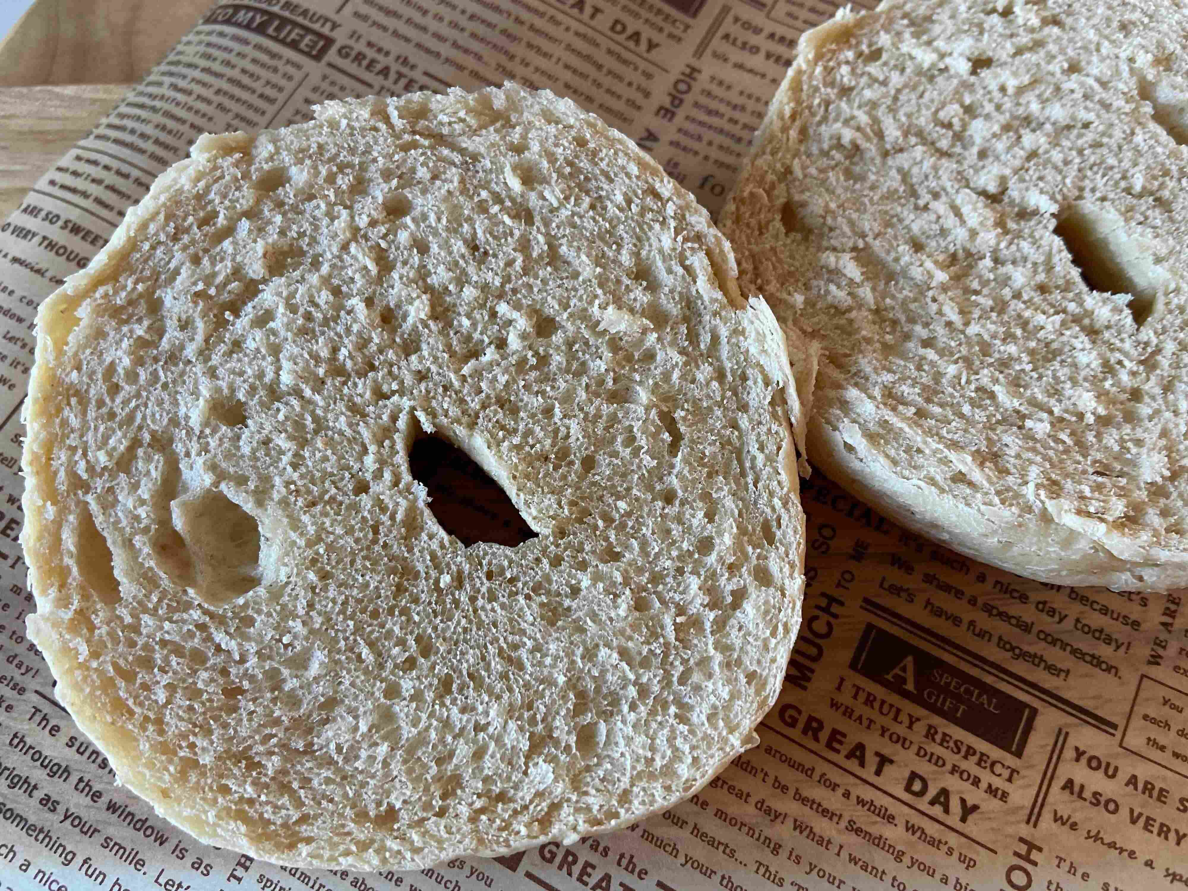 しっかり高さがあってきれいに焼き上がっているベーグル!ベーグルが普通のパンと大きく違うところは焼く前に一度「茹でる」ところ。これにより独特のもっちり食感が生まれるんだそう。