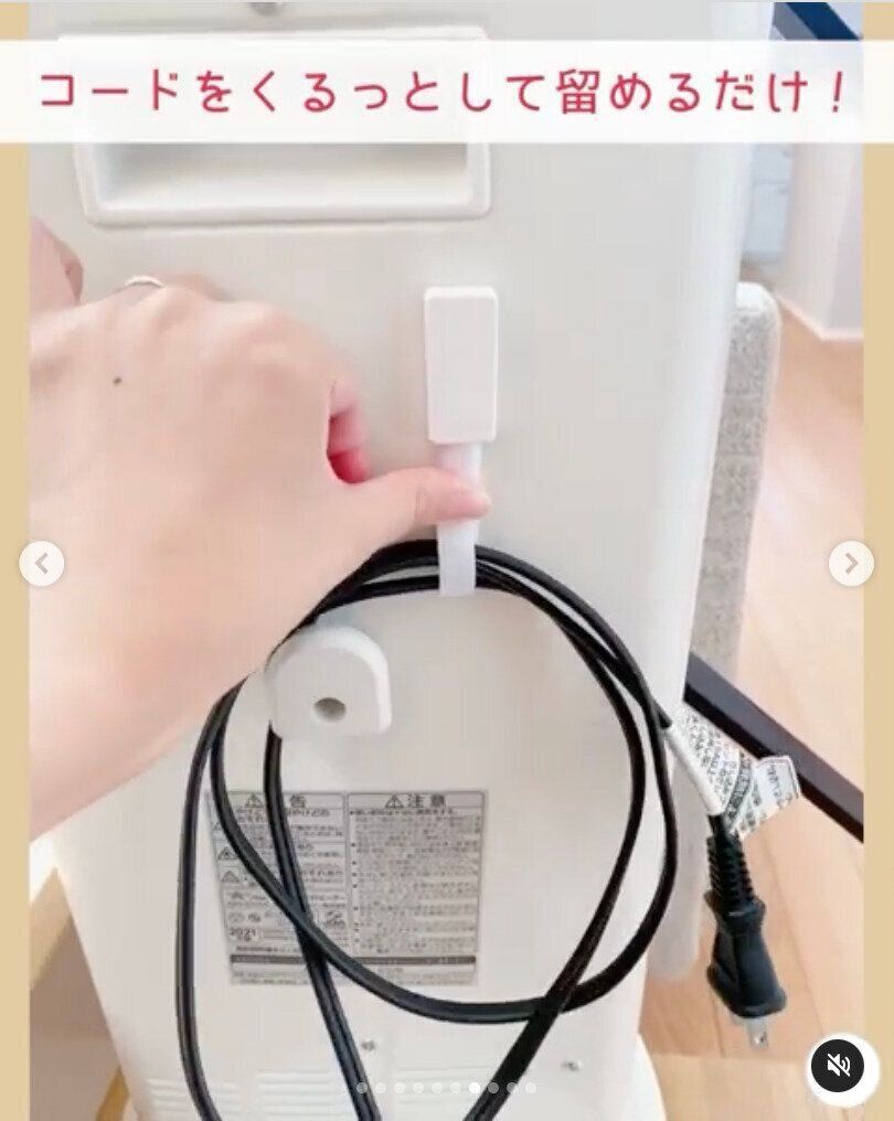 使わなくなった季節家電をしまうときや、日々の掃除などのとき、びよ〜んとのびたコードは地味に邪魔ですよね。コードの収納スペースがある家電もありますが、なくてもセリアの「浮かせて収納コードバンド」を使えば大丈夫。よくある上と下にフックを貼るタイプとは違って、上1カ所に貼り、マジックテープを使ってコードをまとめるタイプです。ズボラさんには、こちらの方が簡単かもしれません!