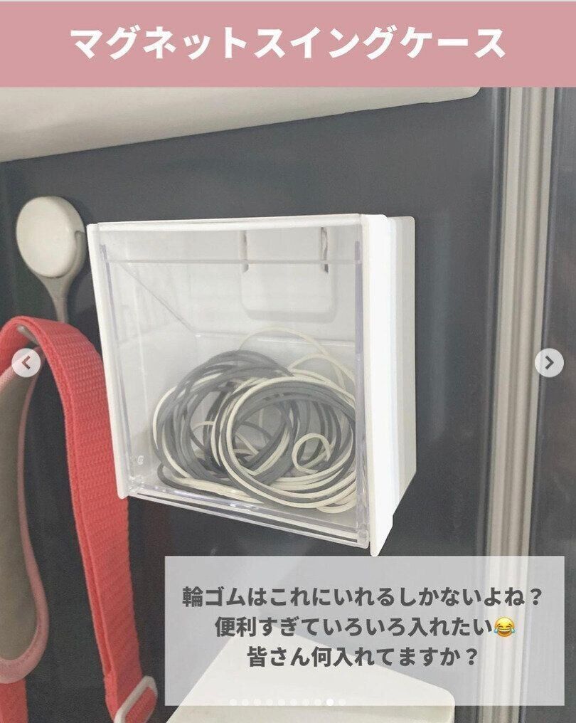 こちらのマグネットスイングケース、透明で中身が見えて、ピタっと閉まるのでホコリも入りにくいんです。キッチンの冷蔵庫などに貼って輪ゴムを入れたり、洗面台の近くに貼って小物を入れたり…アイデア次第でいろいろ使えそうですね。