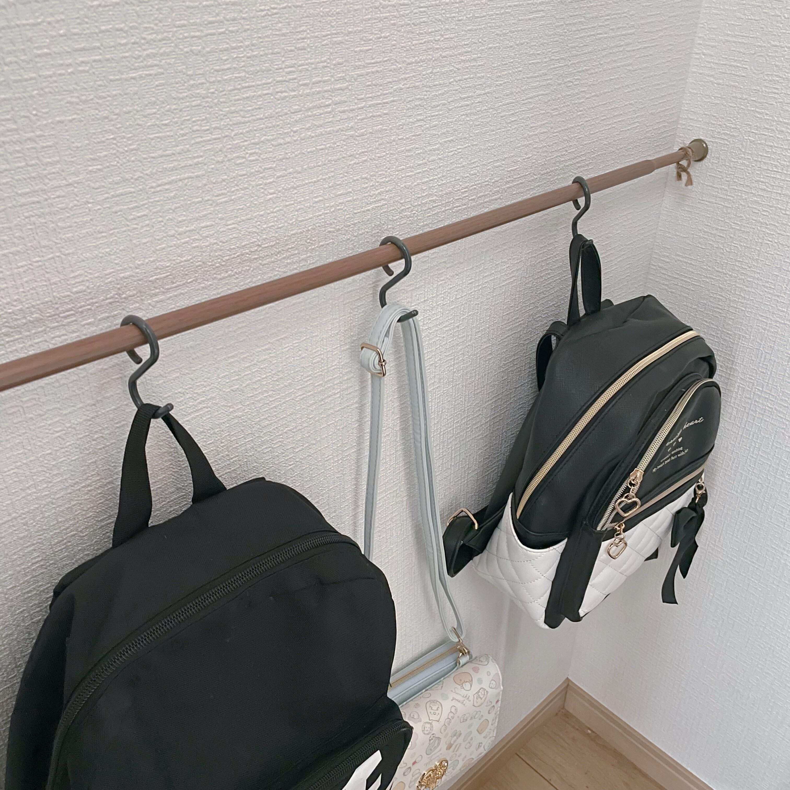 賃貸で壁に穴を開けられなくても大丈夫!突っ張り棒と外れにくいS字フックがあるだけで、カンタンに壁かけ風の収納をつくることができますよ。