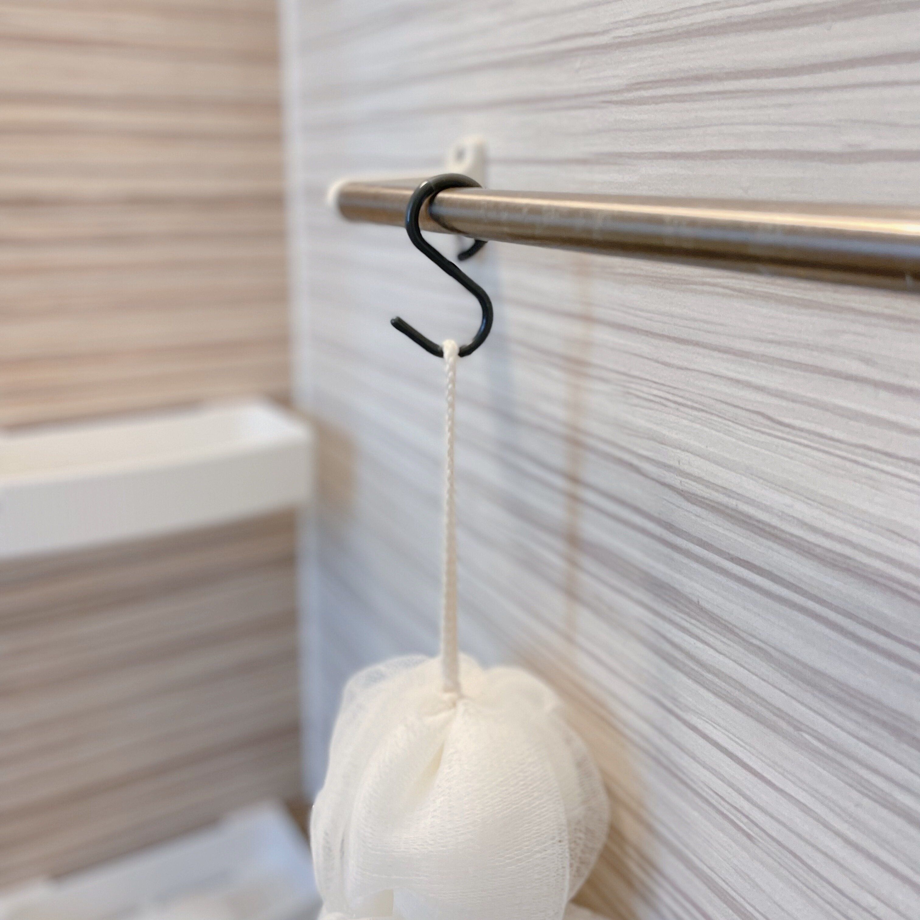 タオルバーに取りつければ、毎日使うボディーネットもサッと取ることができ、S字フックが落下する心配もありません。