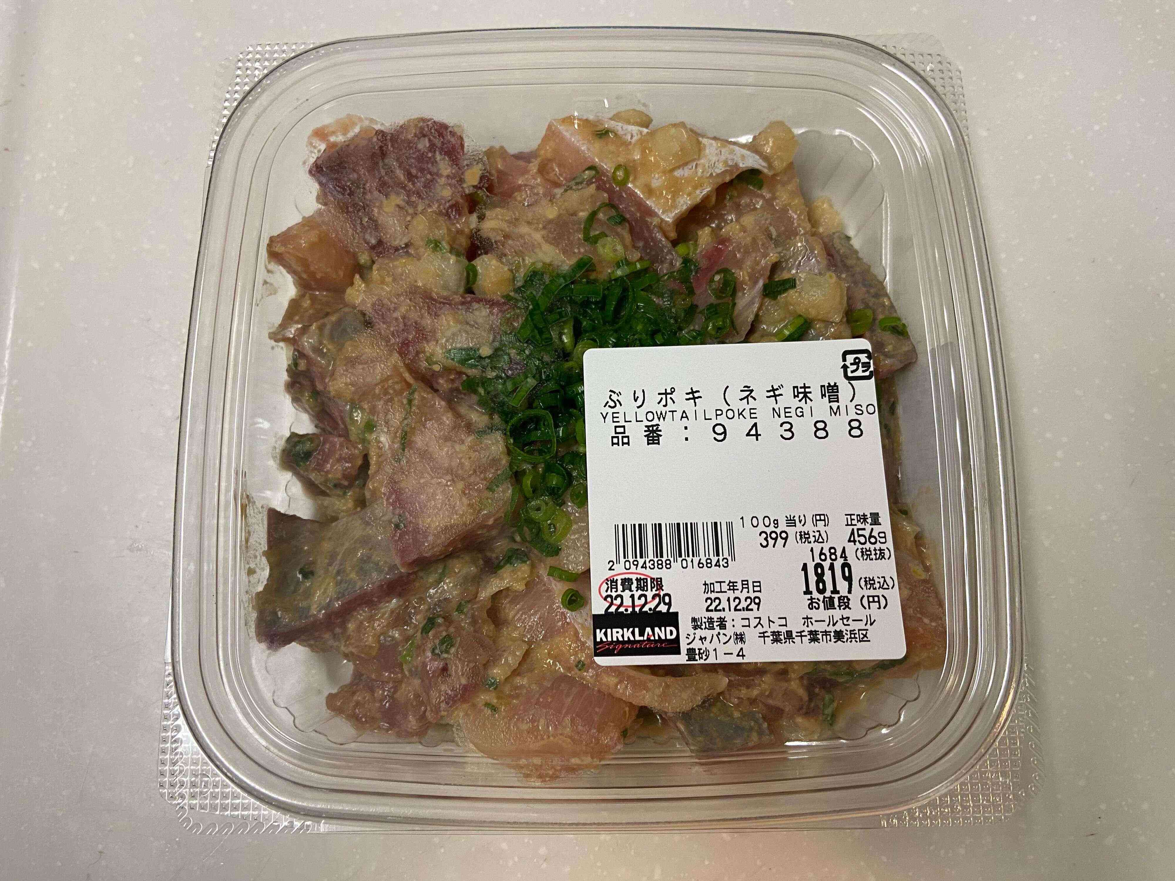 コストコ鮮魚コーナーの大人気商品、ポキシリーズに新登場の「ぶりポキ(ネギ味噌)」(購入時価格:1,819円)を購入しました。