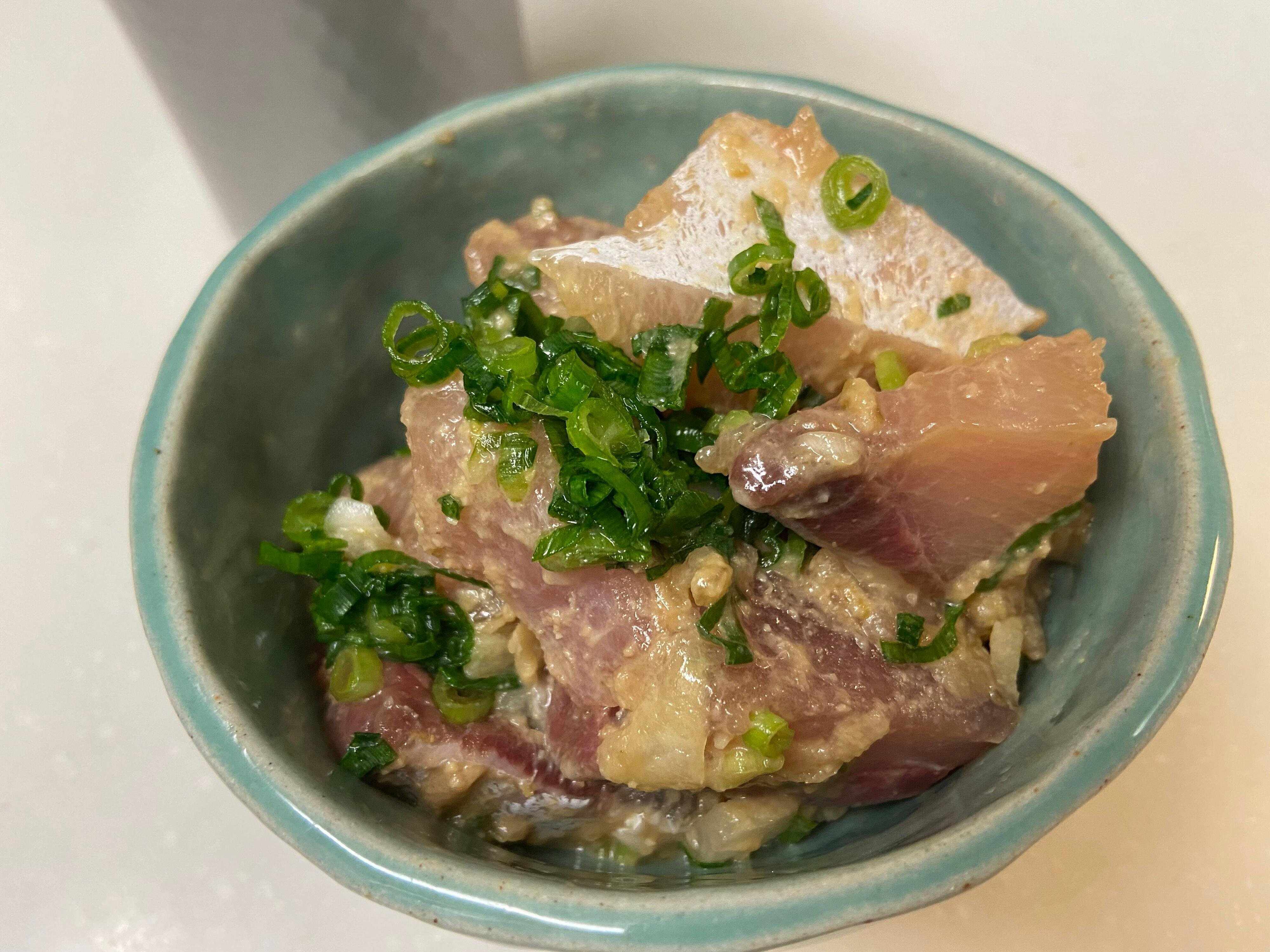 とろける甘さのぶりにピリッと青唐辛子がきいたコクのある味噌ダレがよく合います。刻み玉ねぎのシャキシャキ感がさっぱり感を与え、食感のアクセントにも。お酒のおつまみとしても、ご飯の上にのせて丼にしても最高です。