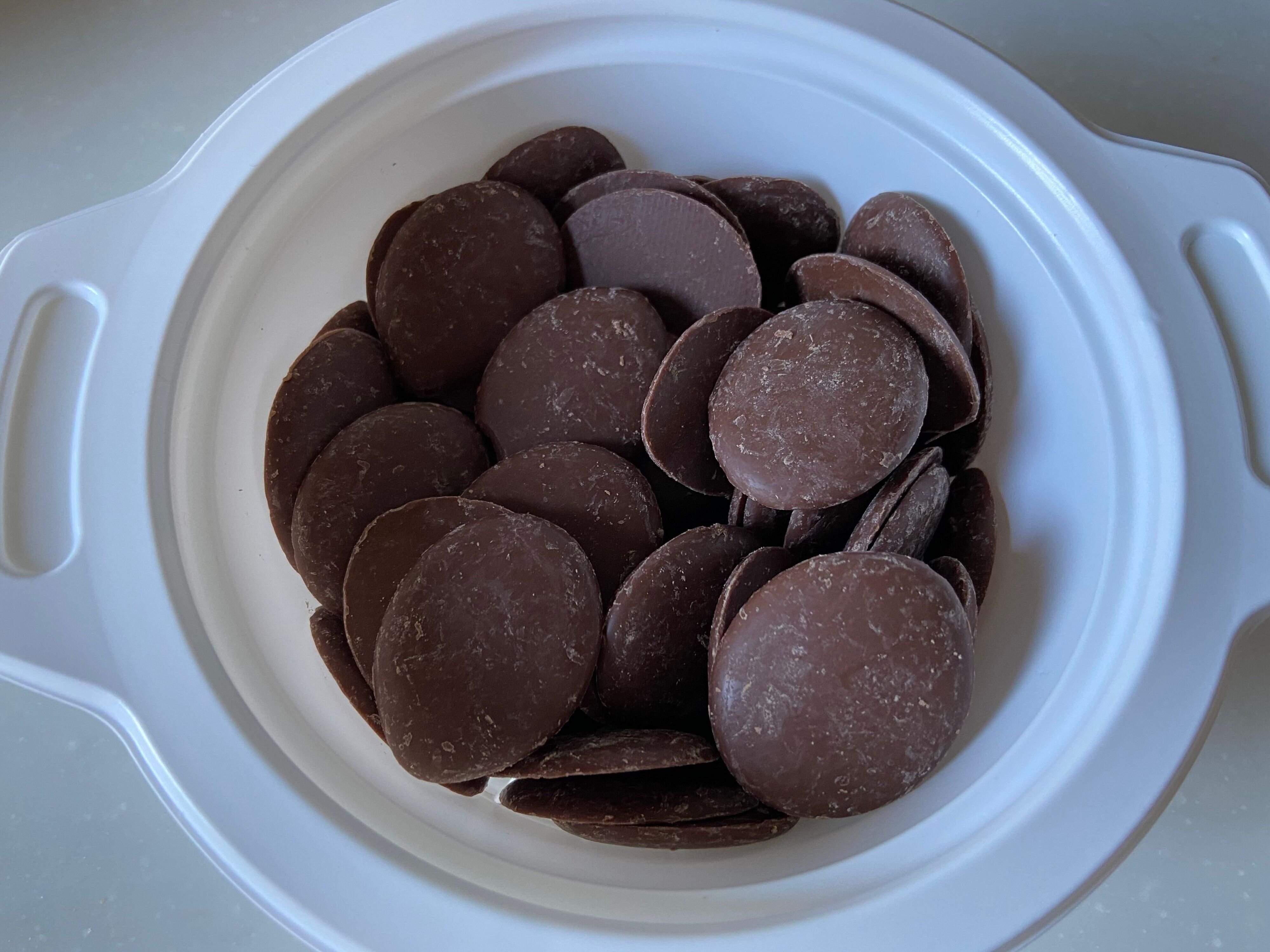 チョコレートを全量容器に移したら、ラップをかけずにこの状態で、電子レンジで500Wにて1分ほど加熱します。
