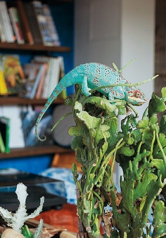 かわいがっているカメレオンも、なんと青!「夫が絶対飼うと。トゥルーブルーという種なんですが、この色は私にとっては緑なんです(笑)」。