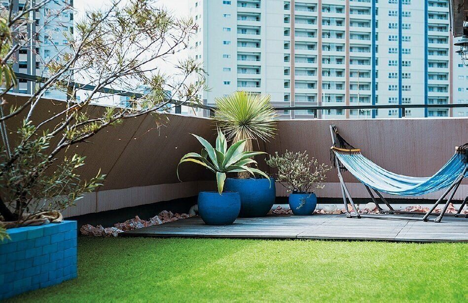 ベランダの広さは56平米と室内よりも広く、友人たちがくつろぎに来ることもあるのだとか。植物の鉢もハンモックも青です!鉢は自分でペイントしました。