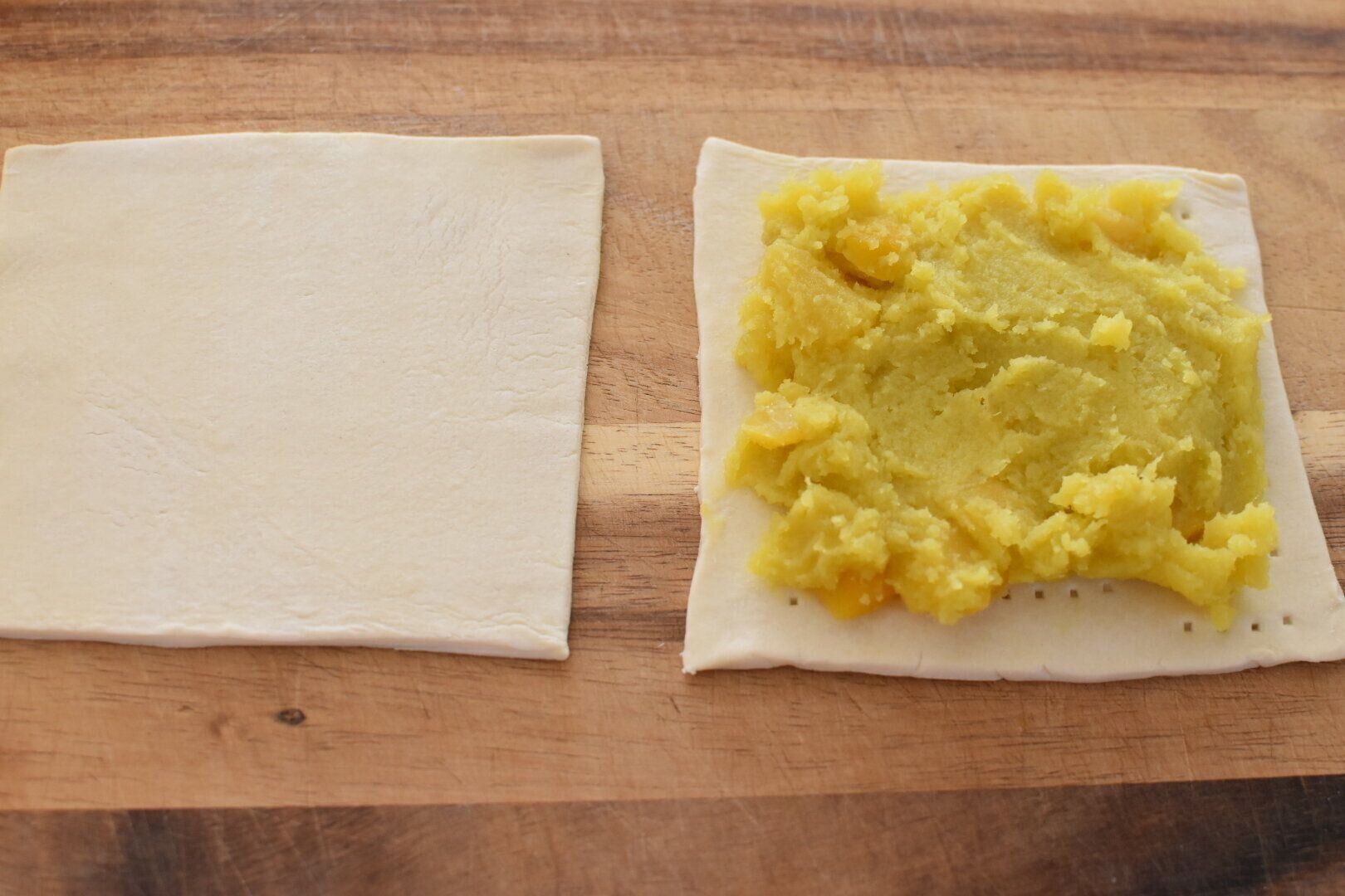 3.パイシートをうすくのばして半分にカットしたら、底になるパイシートにフォークで穴をあけてさつまいもペーストを適量のせる
