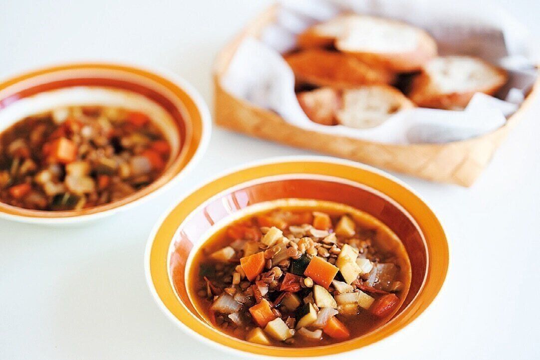 畜産で排出される温室効果ガスが多いことから、週に1回は緩く「肉を食べない日」をつくっているそう。「残り野菜を刻んで炒め、そこに豆を加えて煮込んだスープをよく作ります。食べた翌日は体も軽くなってすっきり!」。