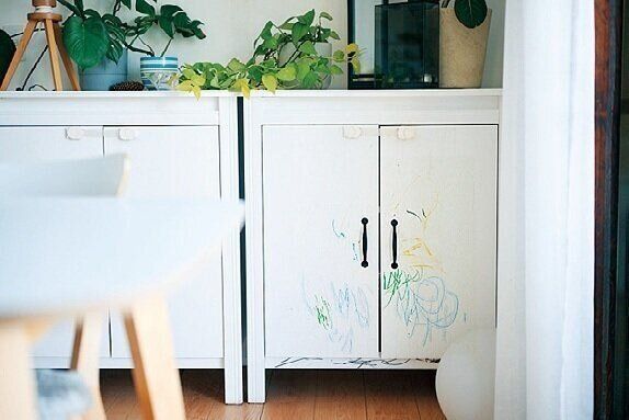 「全部の部屋におもちゃを置きたい」という子どもからのリクエストもあったけれど「リビングと子ども部屋だけ」という約束に。家族みんなの空間だからこそ、線引きが大事。家具への落書きは「また白のペンキで塗ればいいから」と大目に見ています。