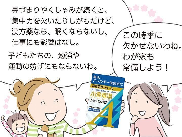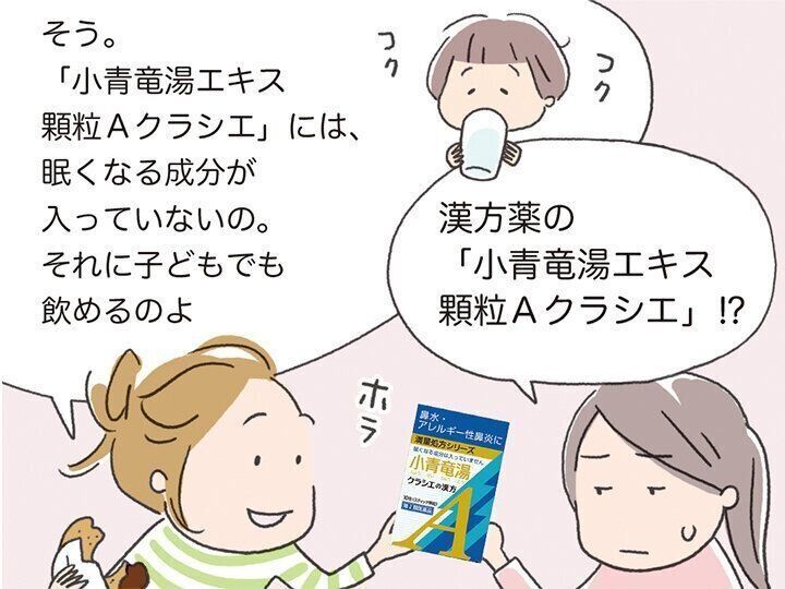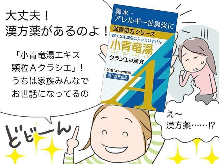 クラシエの「小青竜湯エキス顆粒Aクラシエ」は、4才以上のお子さま(※2)からお年寄りまで服用できるので、家族の鼻かぜ、アレルギー性鼻炎、花粉症ケアにぴったりです。また、眠くなる成分が含まれていないので、運転をするときや仕事、勉強などでパフォーマンスを落としたくないときにも強い味方に。漢方薬は根本治療にも役立つので、体質改善も期待できますね。