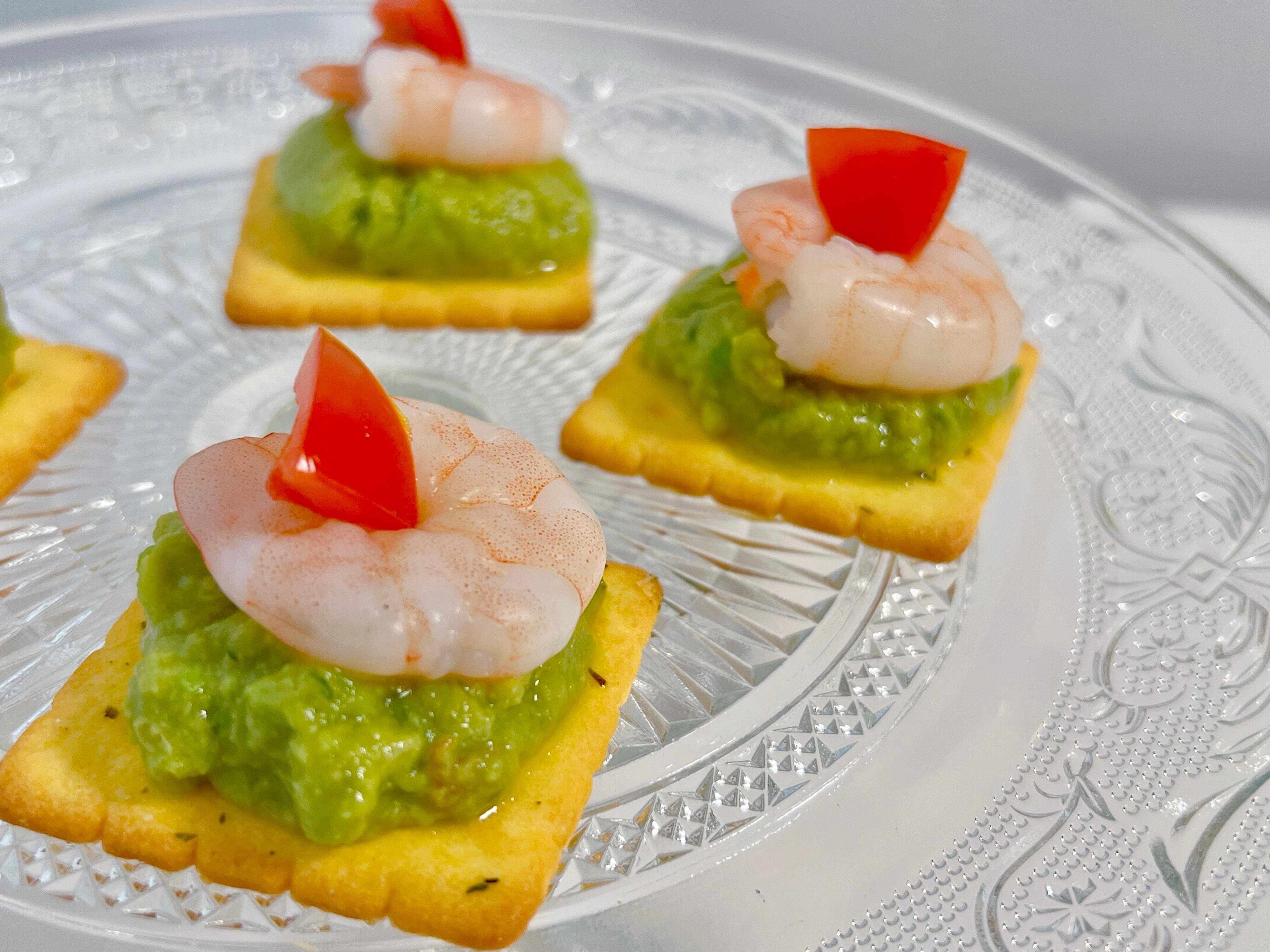フォレストクラッカーの上に、ワカモレとエビを載せるだけで家飲みのおつまみに!クラッカーのオニオン風味がいいアクセントになります。