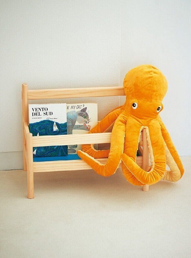 絵本の表紙を見せて収納できるので、小さい子どもでも出し入れ簡単。イケア名物のぬいぐるみは、愛嬌のあるたこにひと目ぼれ!「FLISAT/フリサット ブックディスプレイ」¥2,999、「BLÅVINGAD /ブローヴィンガード ソフトトイ」¥1,990