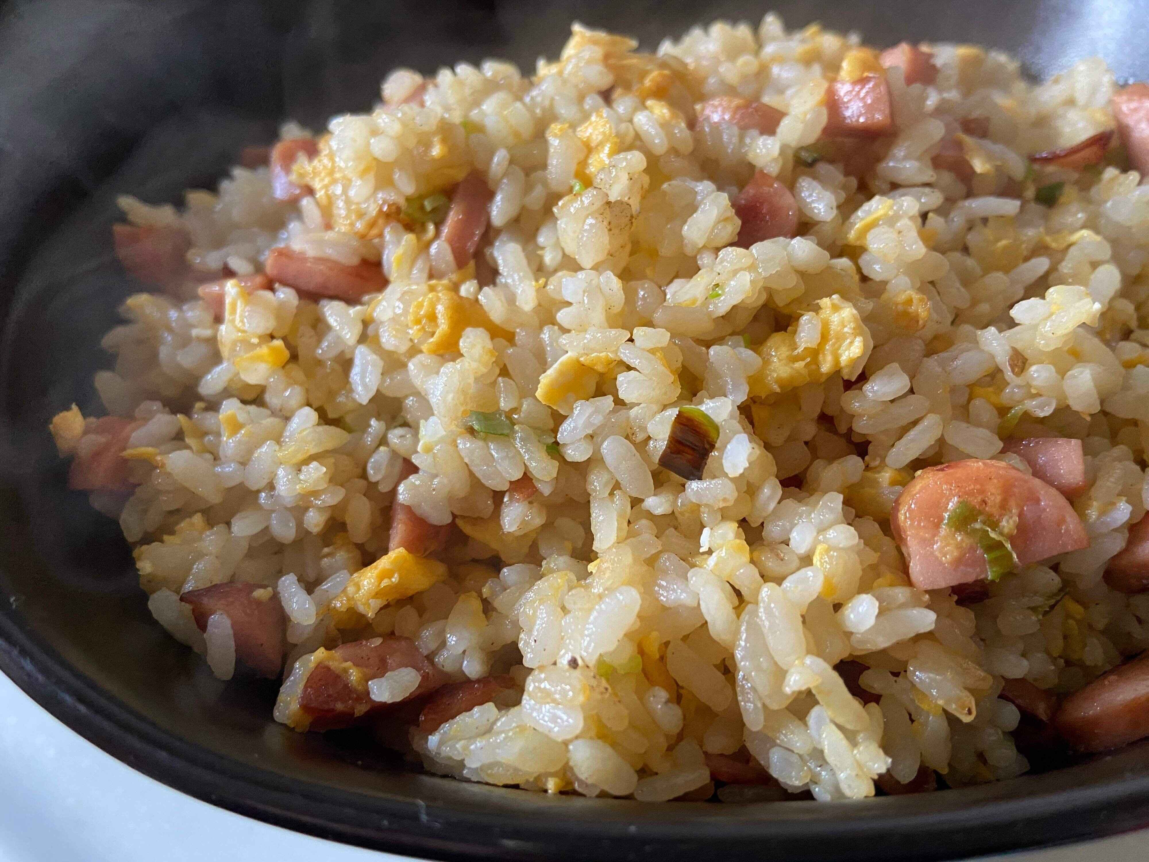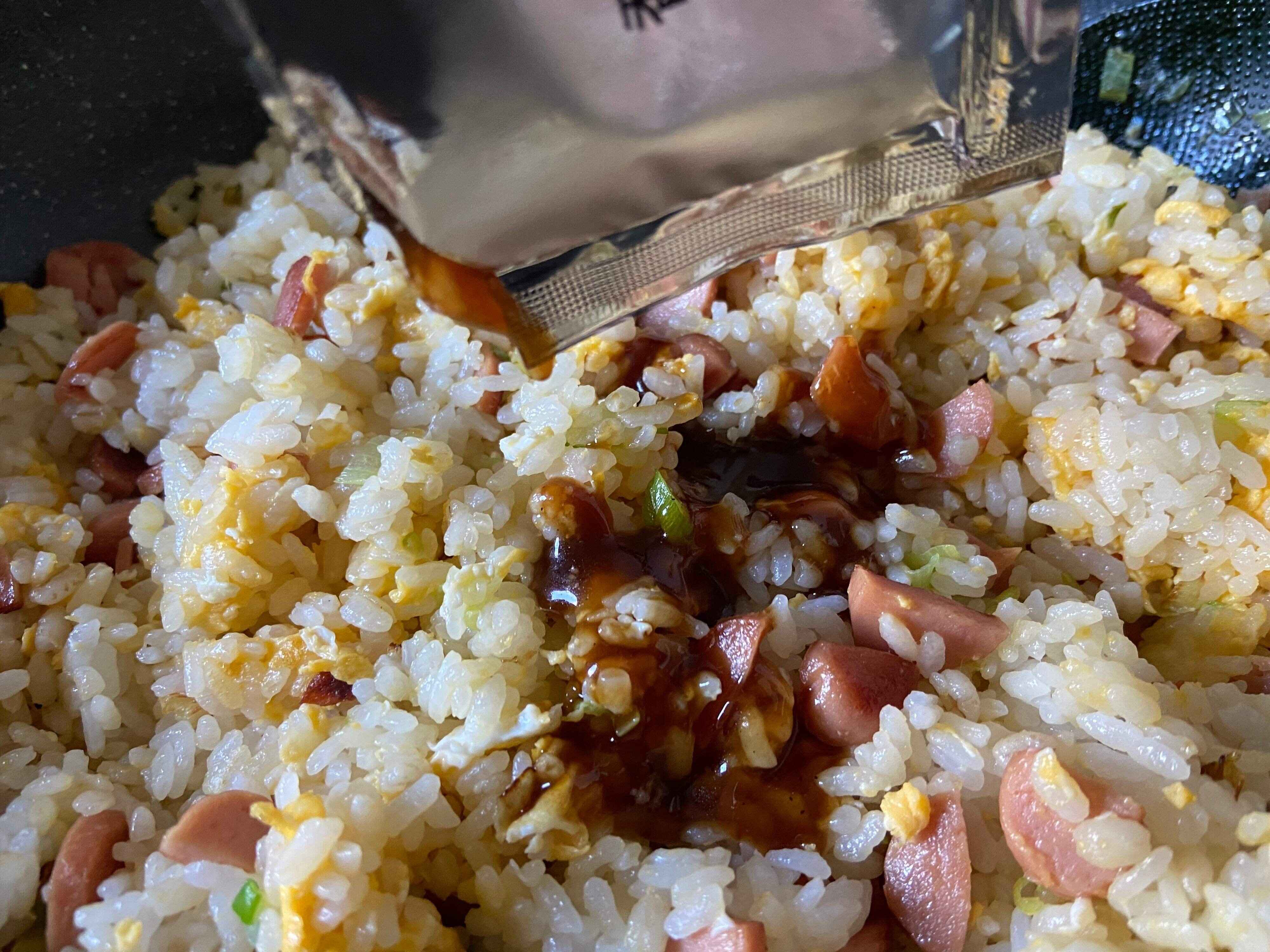 チャーシューを角切りに、長ネギはみじん切りにします。筆者はチャーシューの代わりにウインナーを使いました。フライパンに油を熱し、溶いた卵を入れて半熟状になったらご飯を入れて炒めます。カットした具材も加えて炒めたら、炒飯の素を入れてよく炒め合わせたら完成!