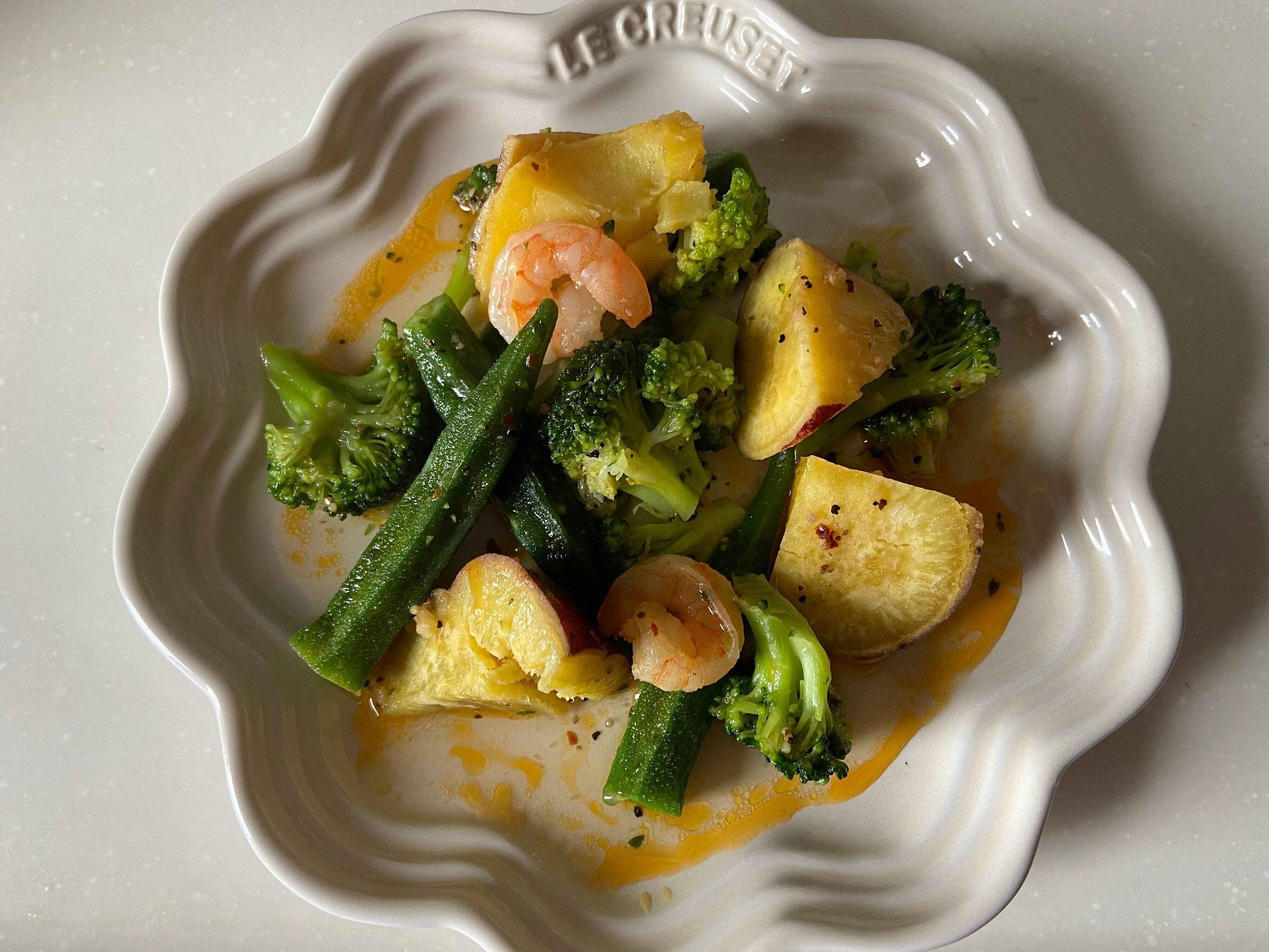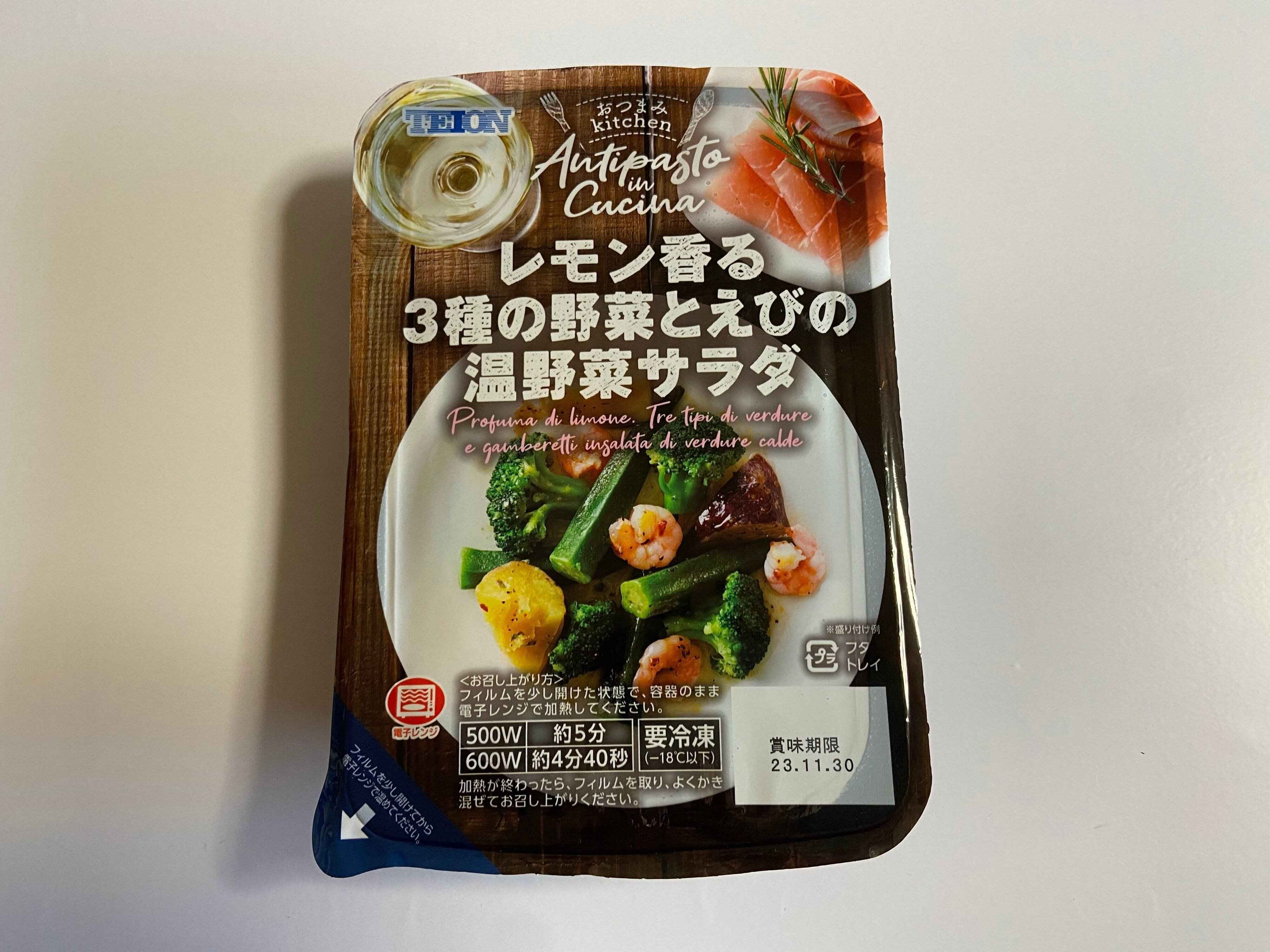 続いてもパッケージの写真がとってもおしゃれな「レモン香る3種の野菜とえびの温野菜サラダ」(購入時:268円)。