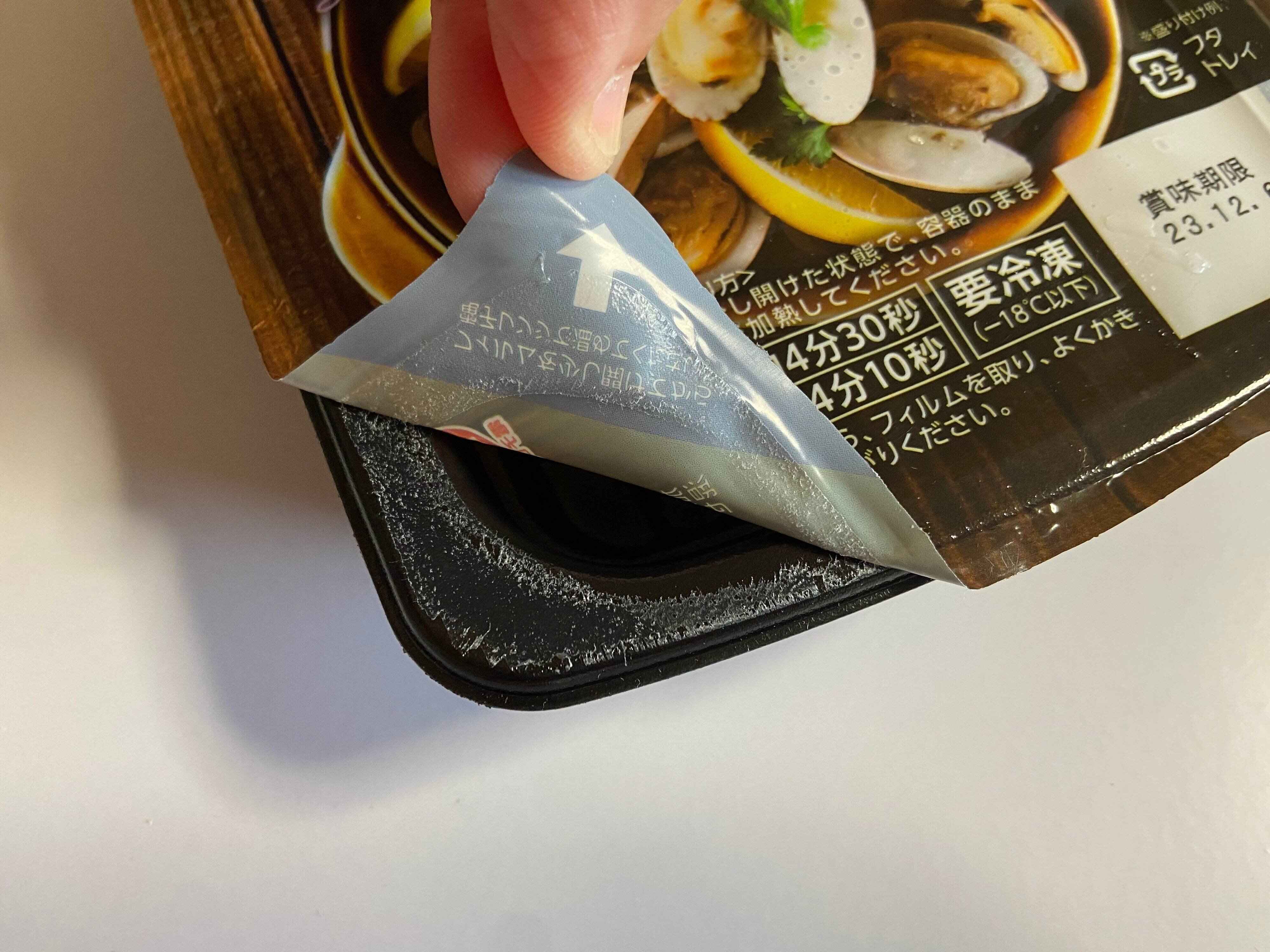 調理方法はこちらも同様、フィルムの端を少しはがして500Wの電子レンジで温めます。加熱時間は約5分。