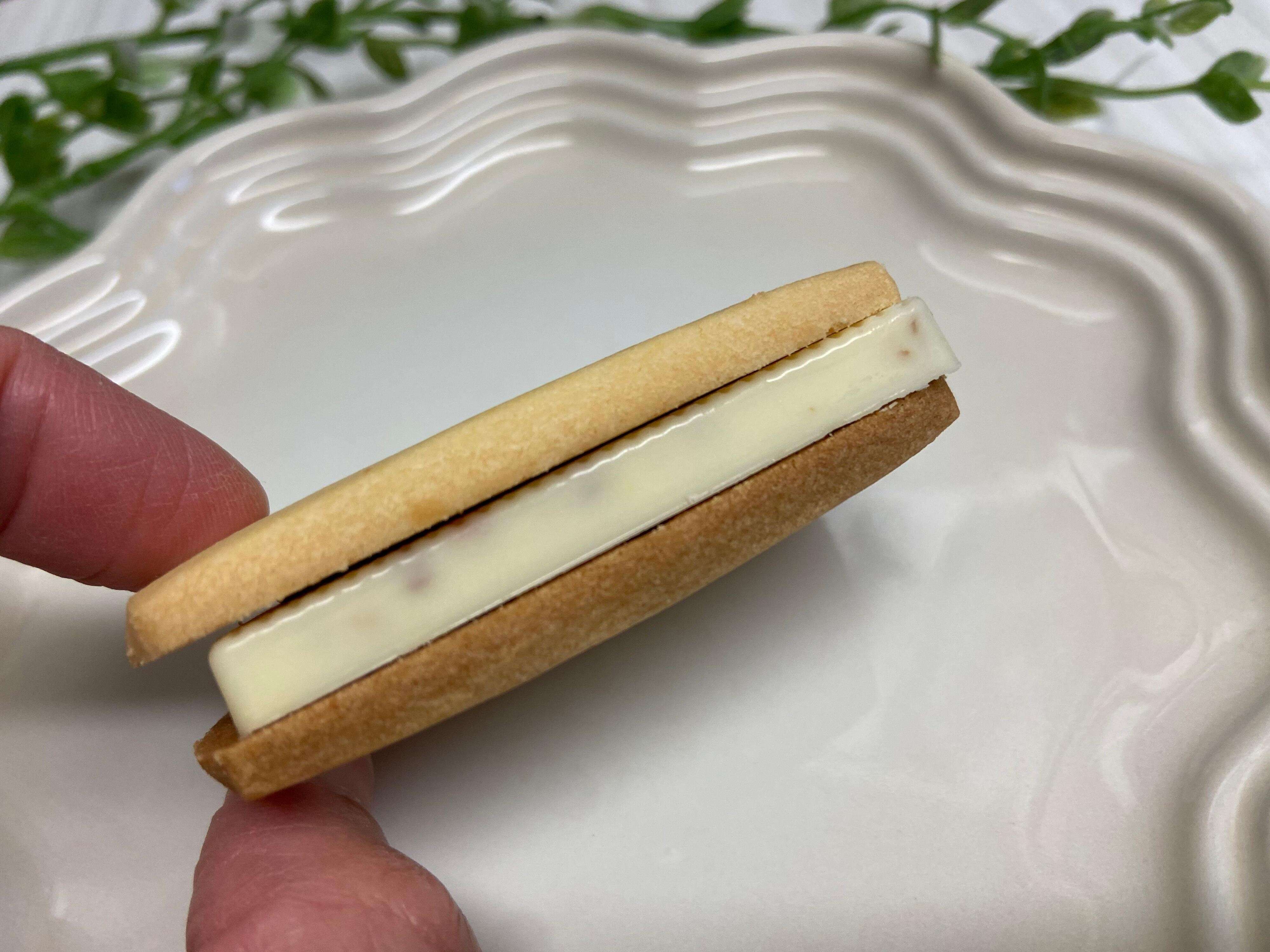 バター風味たっぷりの厚みのあるクッキーで、ホワイトチョコレートをサンドしています。