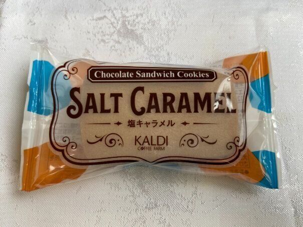 パッケージの色使いがとってもおしゃれなのは、「チョコレートサンドクッキー塩キャラメル」(購入時:140円)です。