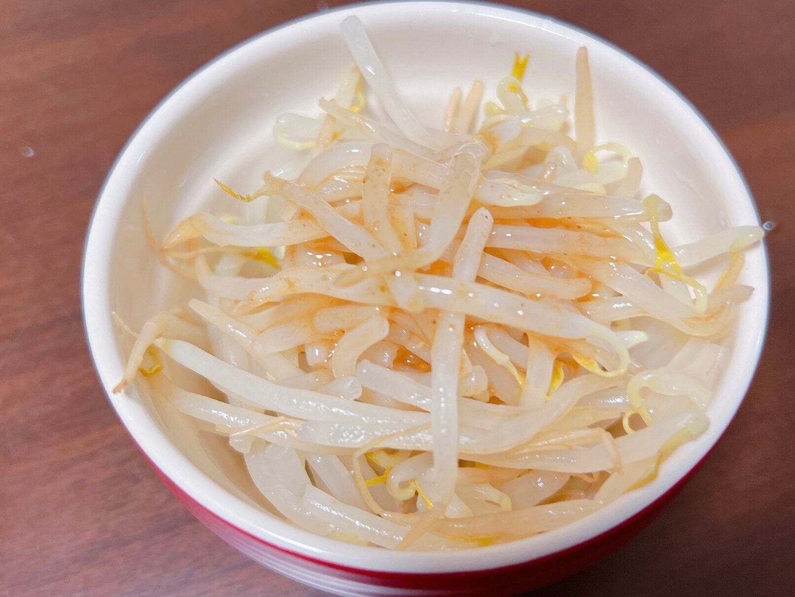 もやしを耐熱容器に移して600Wの電子レンジで2分半加熱して、粗熱が取れたら軽く絞ります。