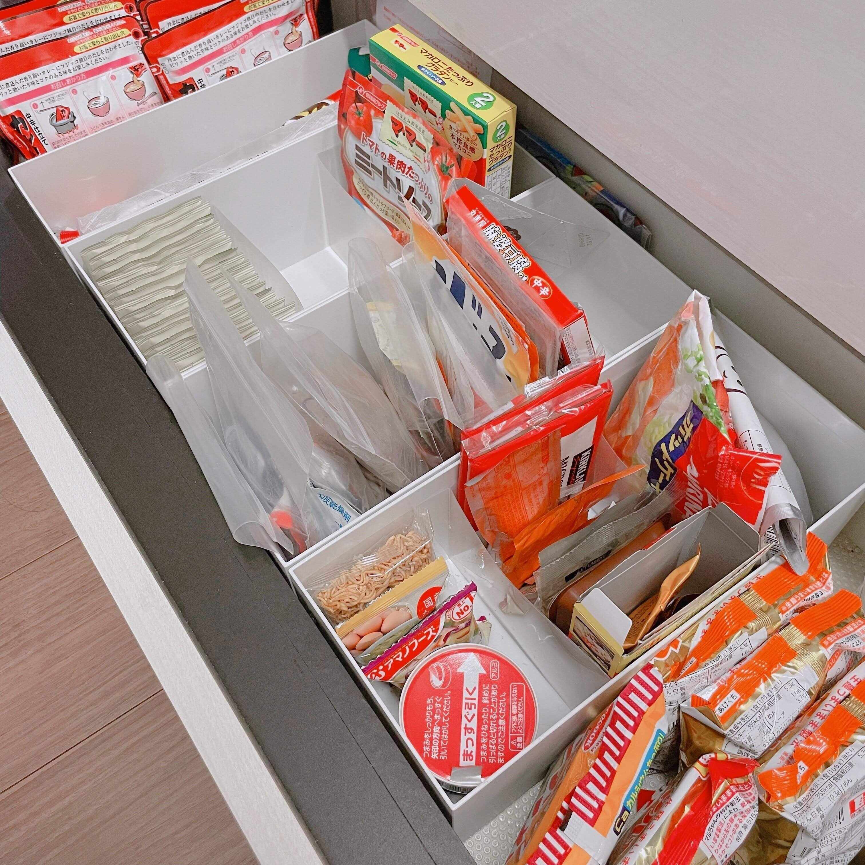 足元収納がついているキッチンの高さにぴったりなので、ここにファイルボックス1/2を並べて、パントリー代わりに使うのもオススメです。