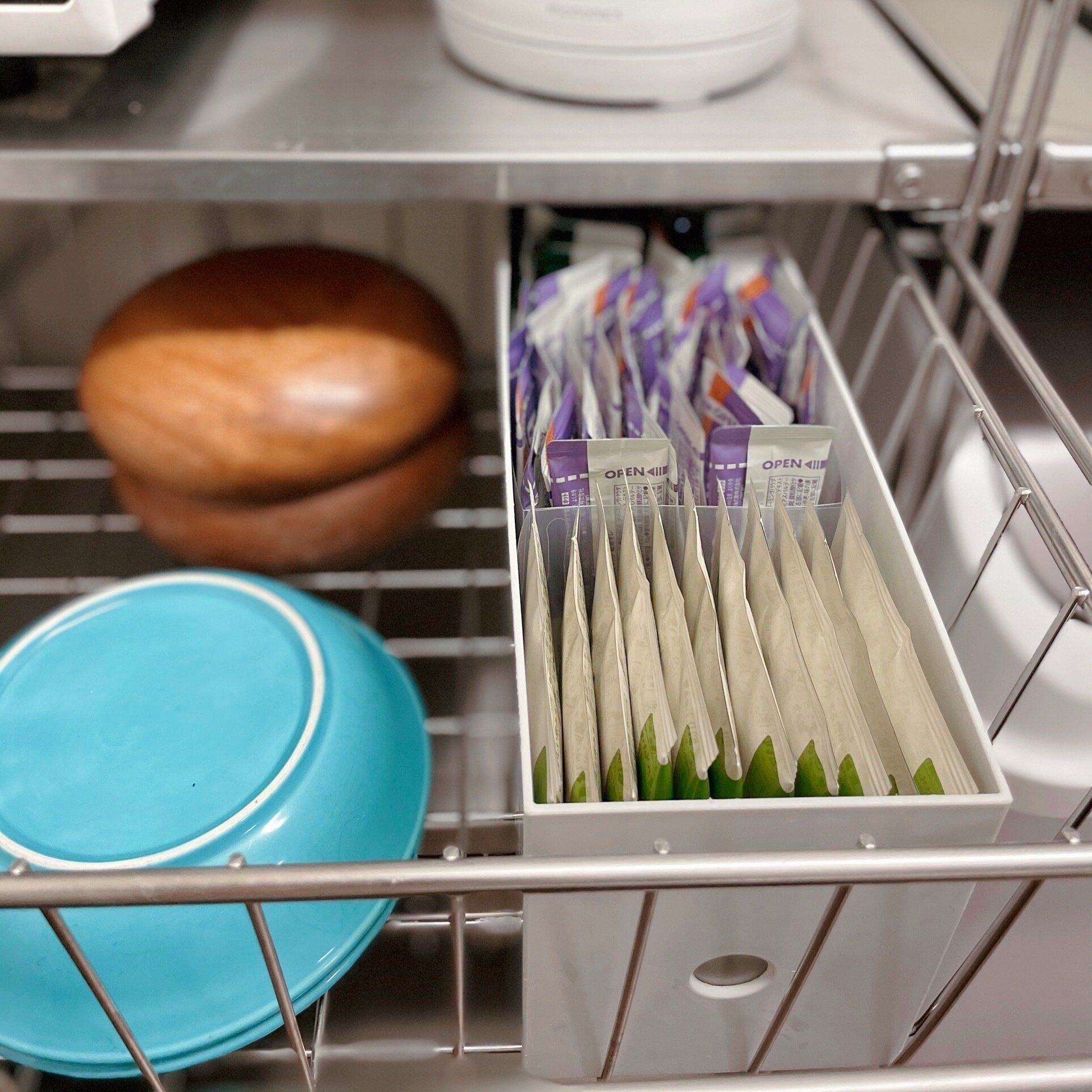 また、スティックコーヒーも立てて収納できるので、種類別に分けてみてもいいですね。