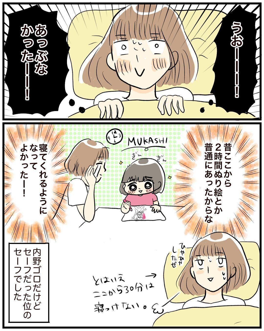 娘さんがスムーズに眠った一方で、サコサコさんの内心は「うおーーー!あっぶなかったーー!」とヒヤヒヤ。