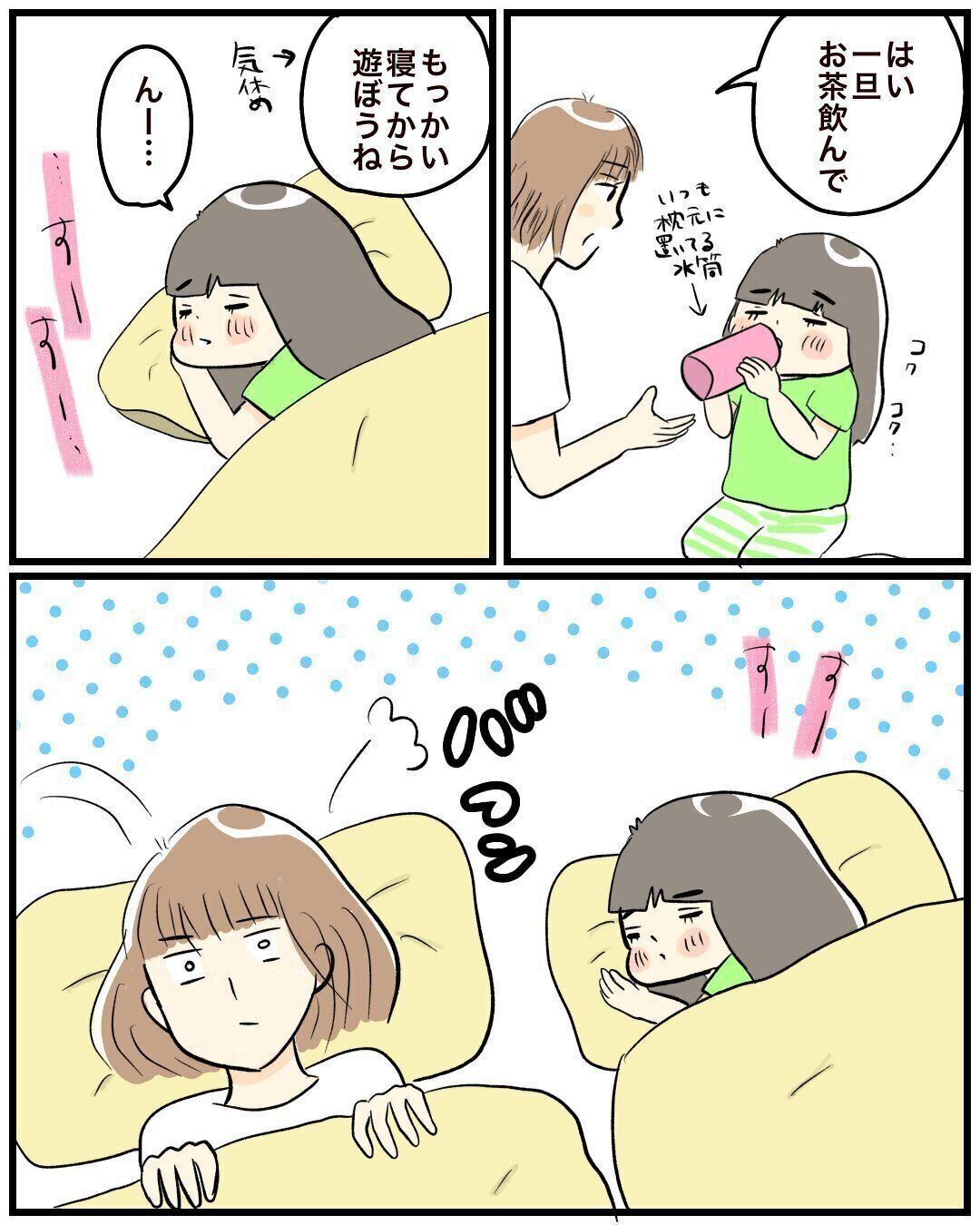 枕元に常備している水筒のお茶を飲ませ「もう一回寝てから遊ぼうね」と声を掛けると、再び娘さんは夢の世界へ……。