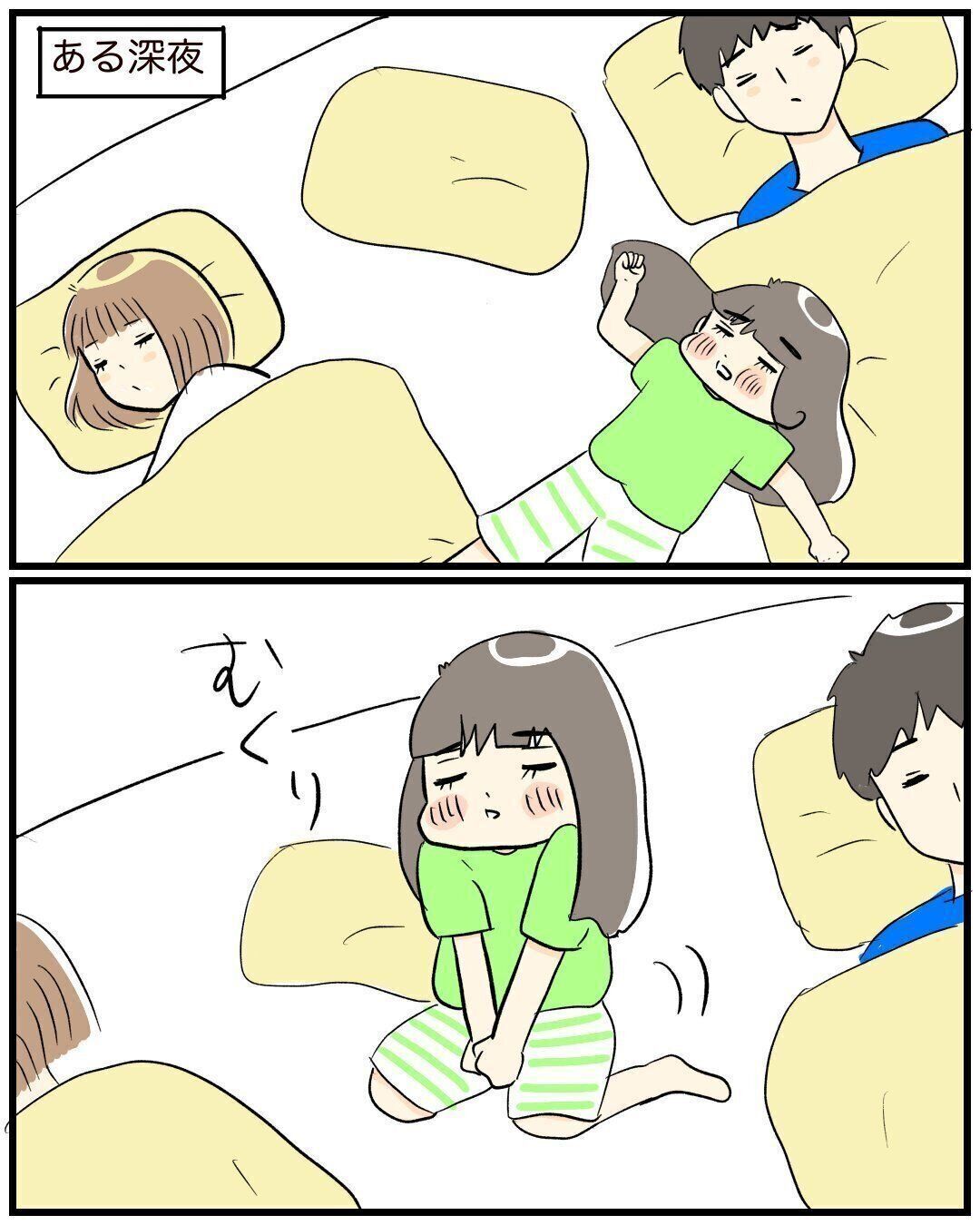 家族がみんな寝静まった真夜中のこと、娘さんが突然むくりと起き上がります。