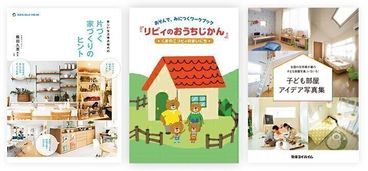 今回、無料でプレゼントされるのは、『片づく家づくりのヒント』『リビィのおうちじかん』『子ども部屋アイデア写真集』 の3冊セット。『片づく家づくりのヒント』と『子ども部屋アイデア写真集』は大人用、『リビィのおうちじかん』は子ども用。家族で学べる3冊です。