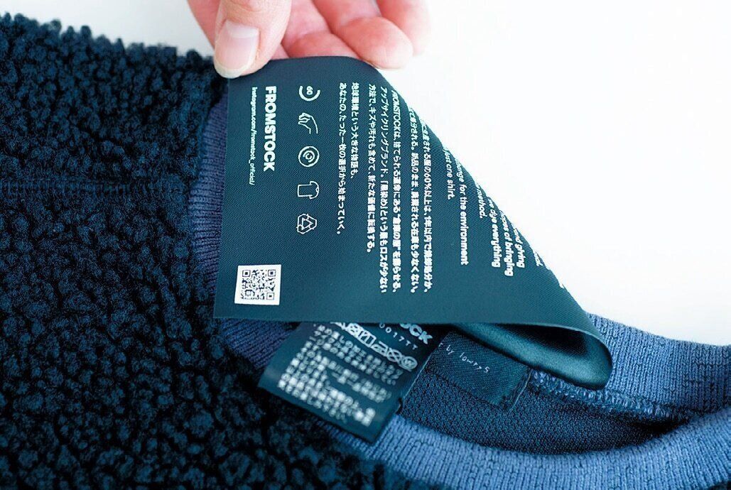 「フロムストック」のタグの下には元のブランドタグが。「元のタグを外す工程を加えると糸くずが出て染め窯が詰まる恐れがあるので、タグはあえてそのままに。コスト増も抑えています」。