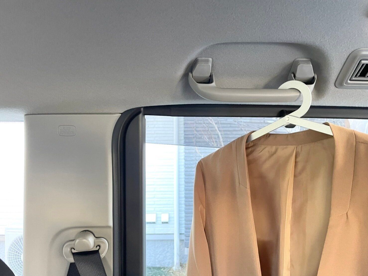 季節の変わり目は朝夕と日中で気温差があるため、コートやジャケットを脱ぐ機会も増えてくるでしょう。そんなときアルミハンガーが1個あれば、上着が不要なときは、車の中に上着を掛けておけますよ。