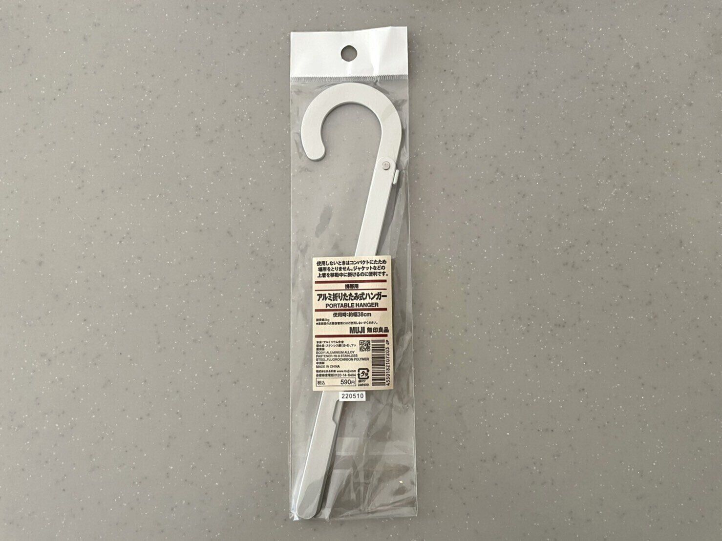 今回ご紹介するのは、無印良品の「携帯用アルミ折りたたみ式ハンガー」です。サイズは、幅25×厚み6.2×高さ0.8cmで、使用時は幅約38cmとなっています。素材がアルミでできていて、価格は590円です。