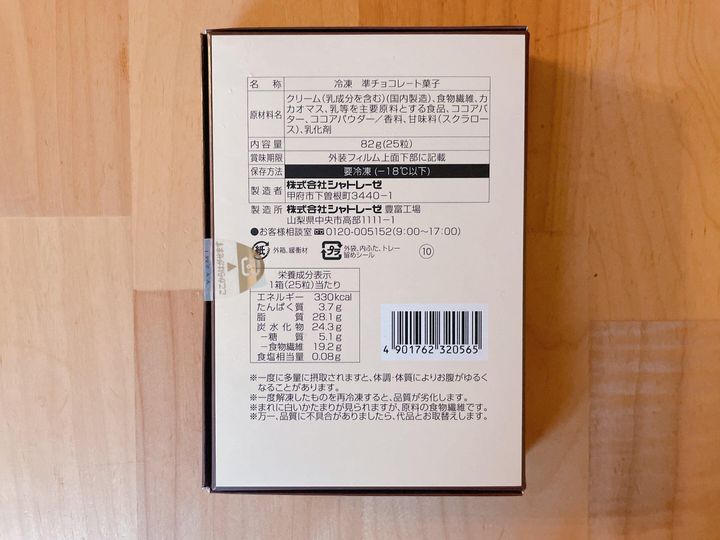 砂糖は一切使用されず、クリームを主成分として食物繊維、カカオマス、ココアバター、ココアパウダーが原材料となっています。