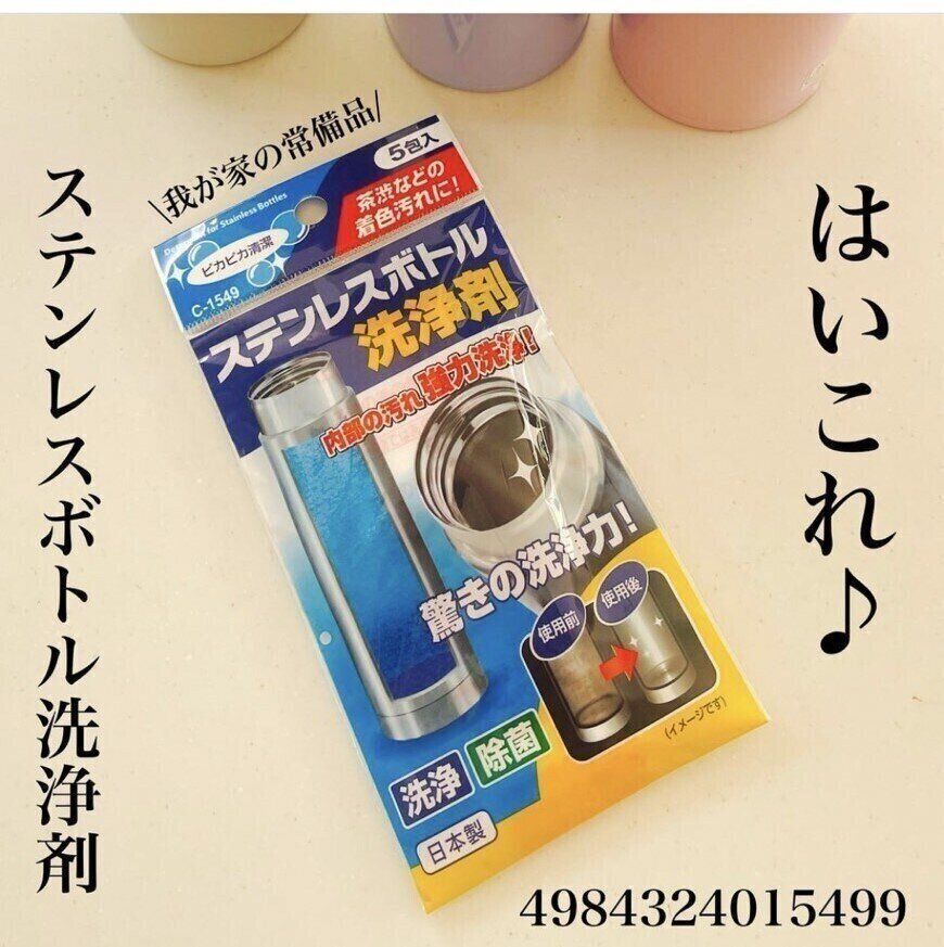 普段ただ洗うだけではステンレスボトルの底は、なかなかきれいに洗いきれませんよね。ステンレスボトルを毎日のように使う方も多いと思いますが、そんな方におすすめしたいのが、「ステンレスボトル洗浄液」(5包入り110円)。ステンレスボトルに40度程のお湯を注ぎ、薬剤を投入。約2時間したら洗い流して洗浄終了です。普段口にするものなので定期的に洗浄を行い、清潔な状態を保ちたいですね。