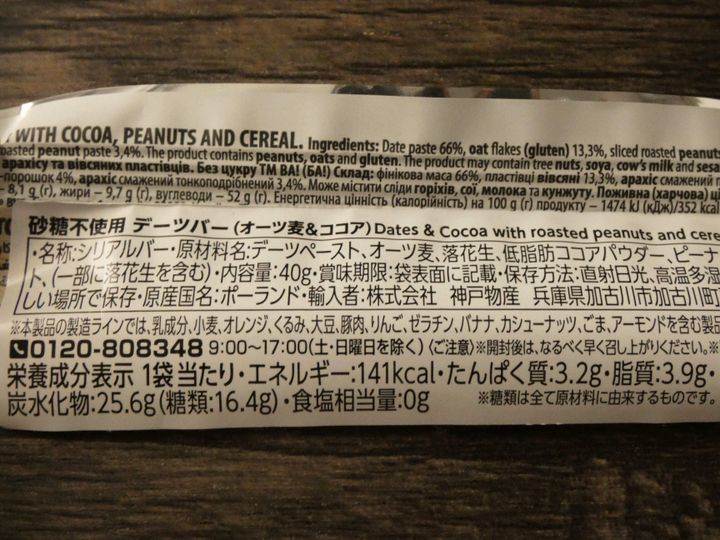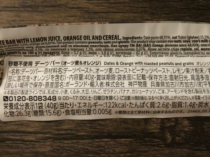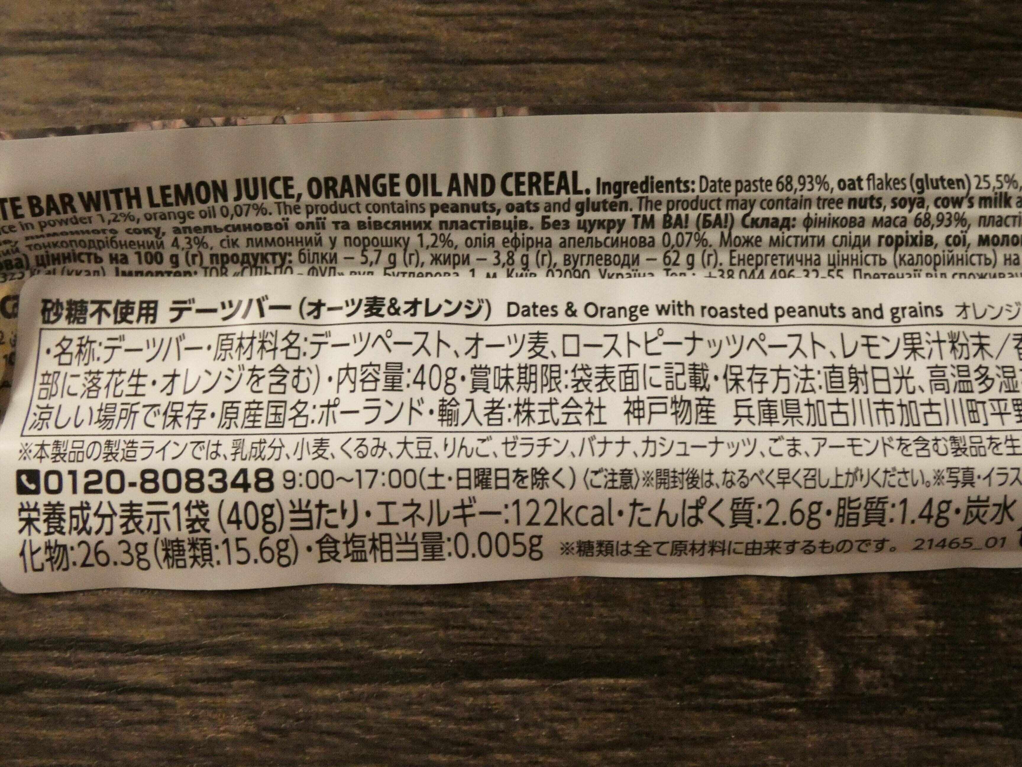 砂糖不使用のデーツバー「オーツ麦&ココア」と「オーツ麦&オレンジ」は各73円。1本でこの値段はコスパ抜群です。