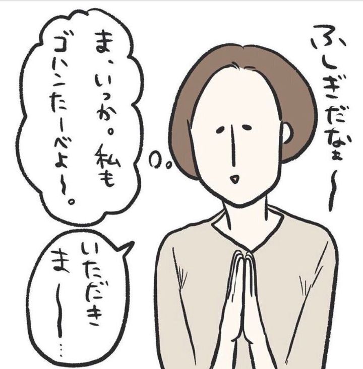 結局これといった理由は見つからないまま、どうして顔が汚れるのか(不思議だな~)と思いつつ、ジェーコさんは自分も食事をしようと手を合わせます。