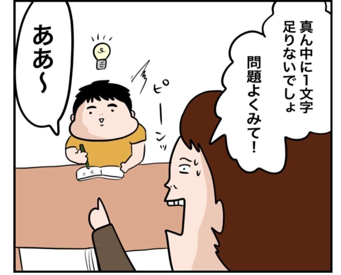 「真ん中に1文字足りないでしょ」というアドバイスに、ピンときただいごろうくん。再び書いたその解答は……