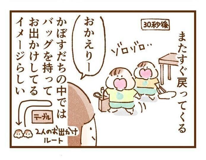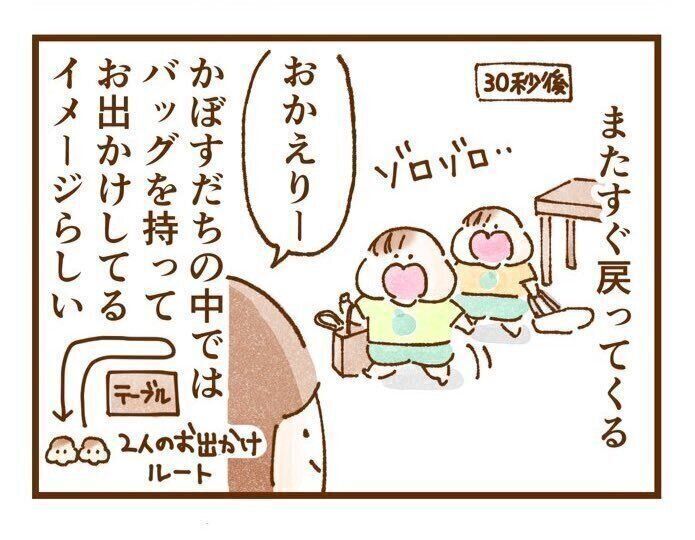いよかん@3y双子育児漫画さん(@k_iyokan)がTwitterで、「はじめてのおつかい風に出かけて行く双子のお出かけルートは…」というコメントとともに漫画を紹介したところ、かわいい結末に反響が寄せられています。作者にお話を聞きました。