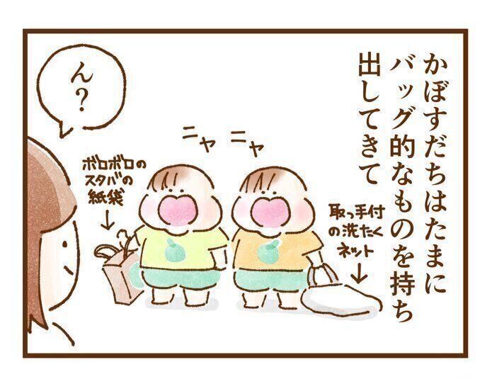 「漫画で描いた時期は、バッグ的なものを持ってリビング内をウロウロしているだけでしたが、3歳になった現在では、2人でそれぞれ店員さん、お客さんになってお店屋さんごっこをしてよく遊んでいます!」