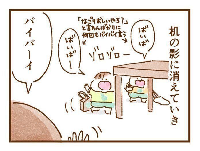 すると姉妹は「ばいば」「ばいばー」と何回も言いながら、机の影に消えていきました。いよいよお出かけのようですね。いったいどこに出かけるのかな?