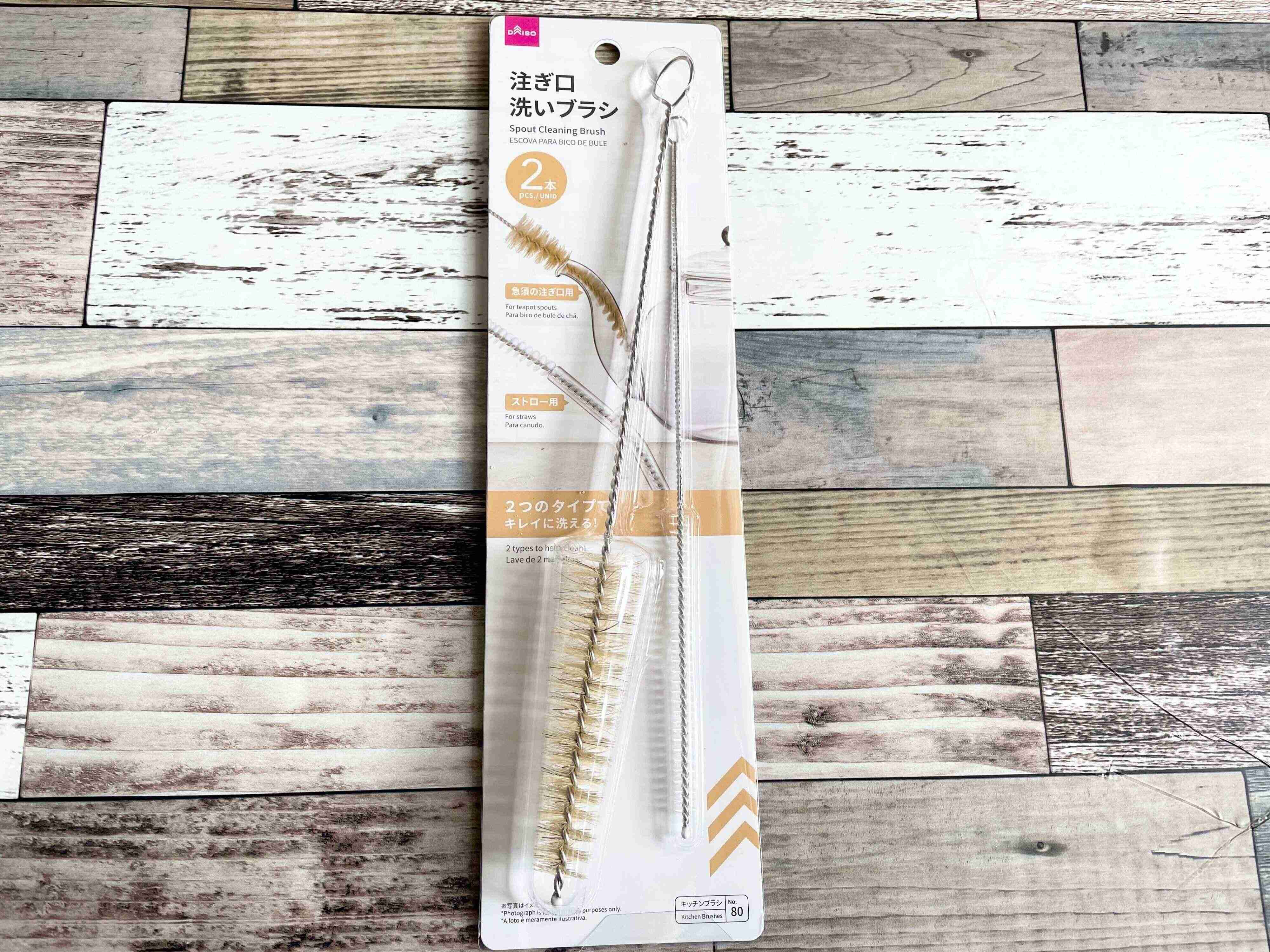 ご紹介するのは、ダイソーの注ぎ口洗いブラシです。太いタイプと細いタイプの2本組で110円。