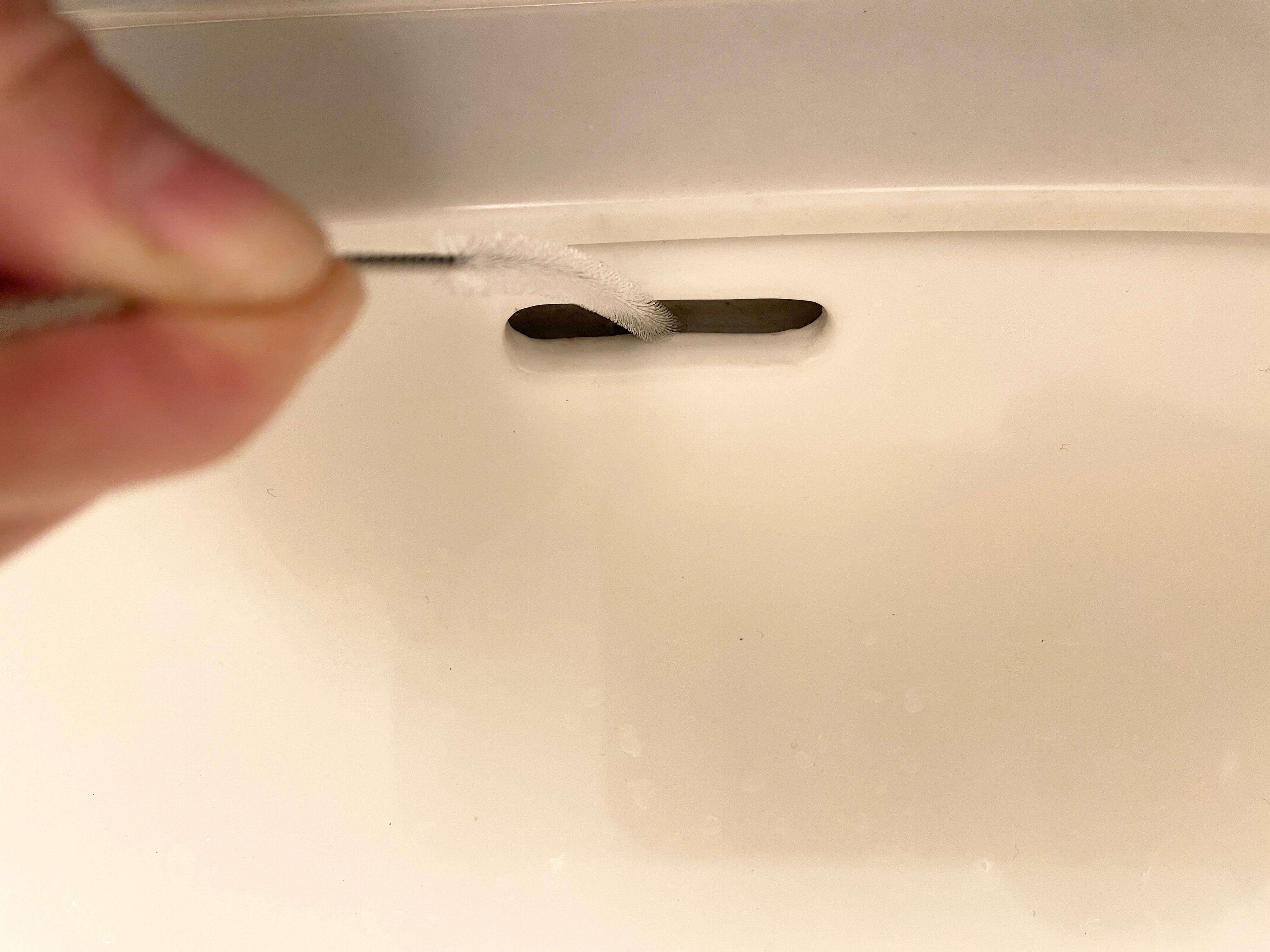 注ぎ口ブラシをちょっと曲げて角度をつけると、オーバーフローの掃除にも使えます。漂白剤やパイプ用洗剤で落ち切れなかった汚れのこすり洗いにおすすめです。