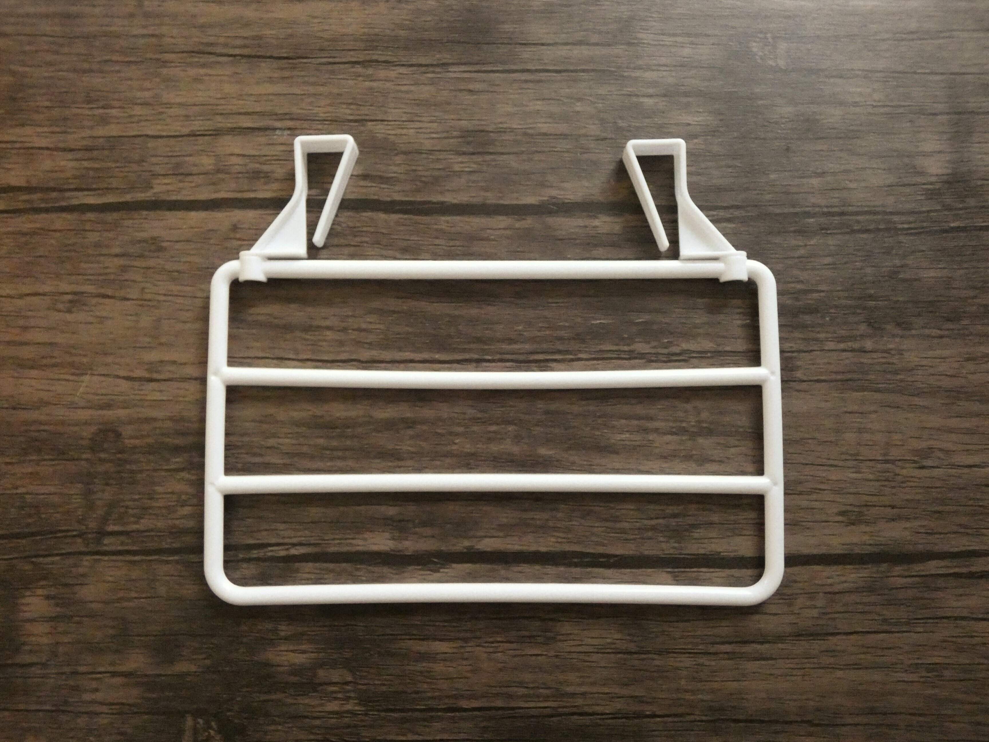 扉に引っかけるだけで、ゴミ袋の仕分けができるハンガーです。サイズは横26.2cm、縦21cm、幅1.6cm。