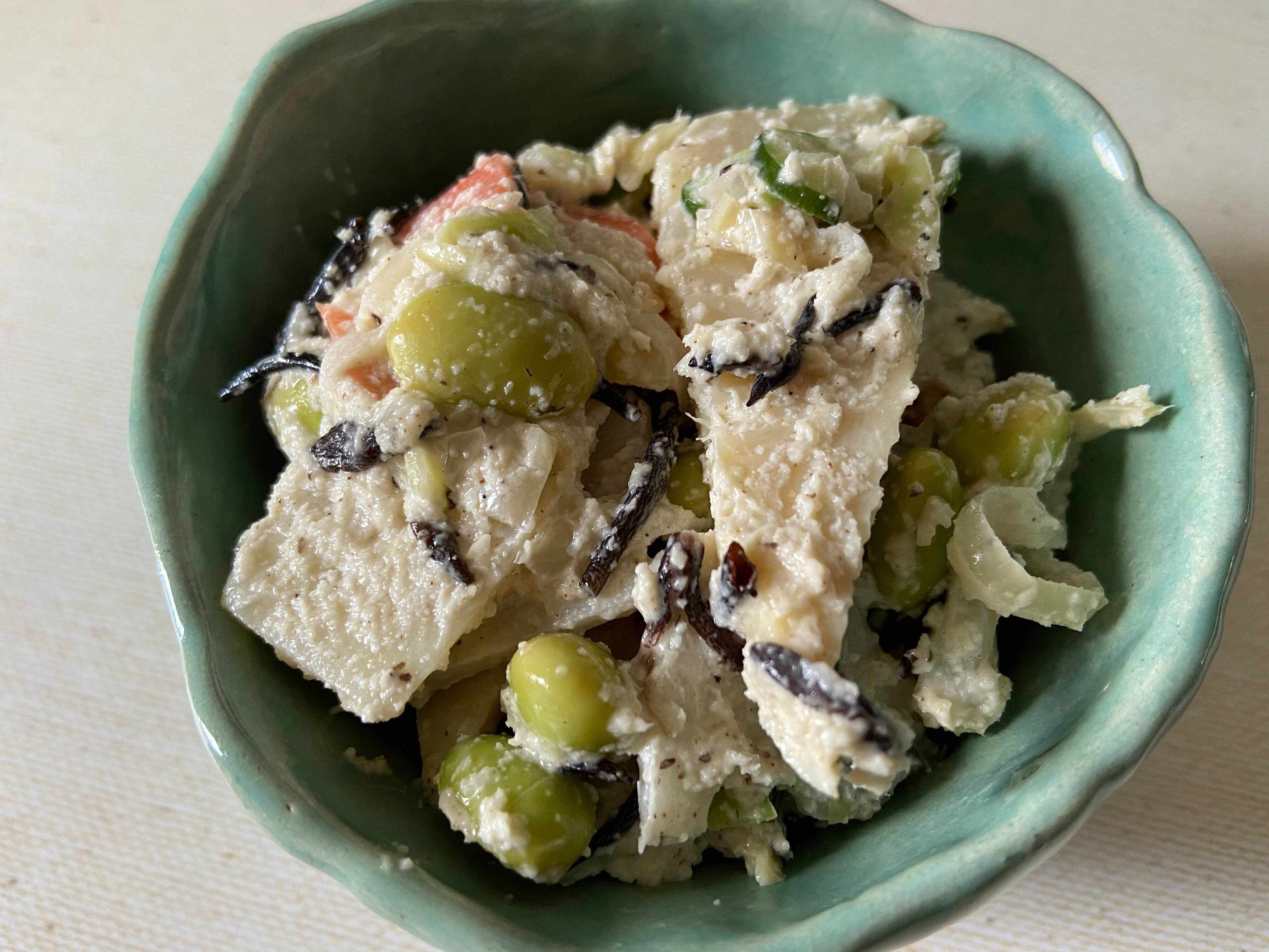 野菜がたっぷりで食感も楽しめる、それぞれの素材の味が活きた、ロピアの枝豆と穂先筍の和サラダ。一見地味ですが、とっても味わい深い毎日食べたくなるおいしさでした。