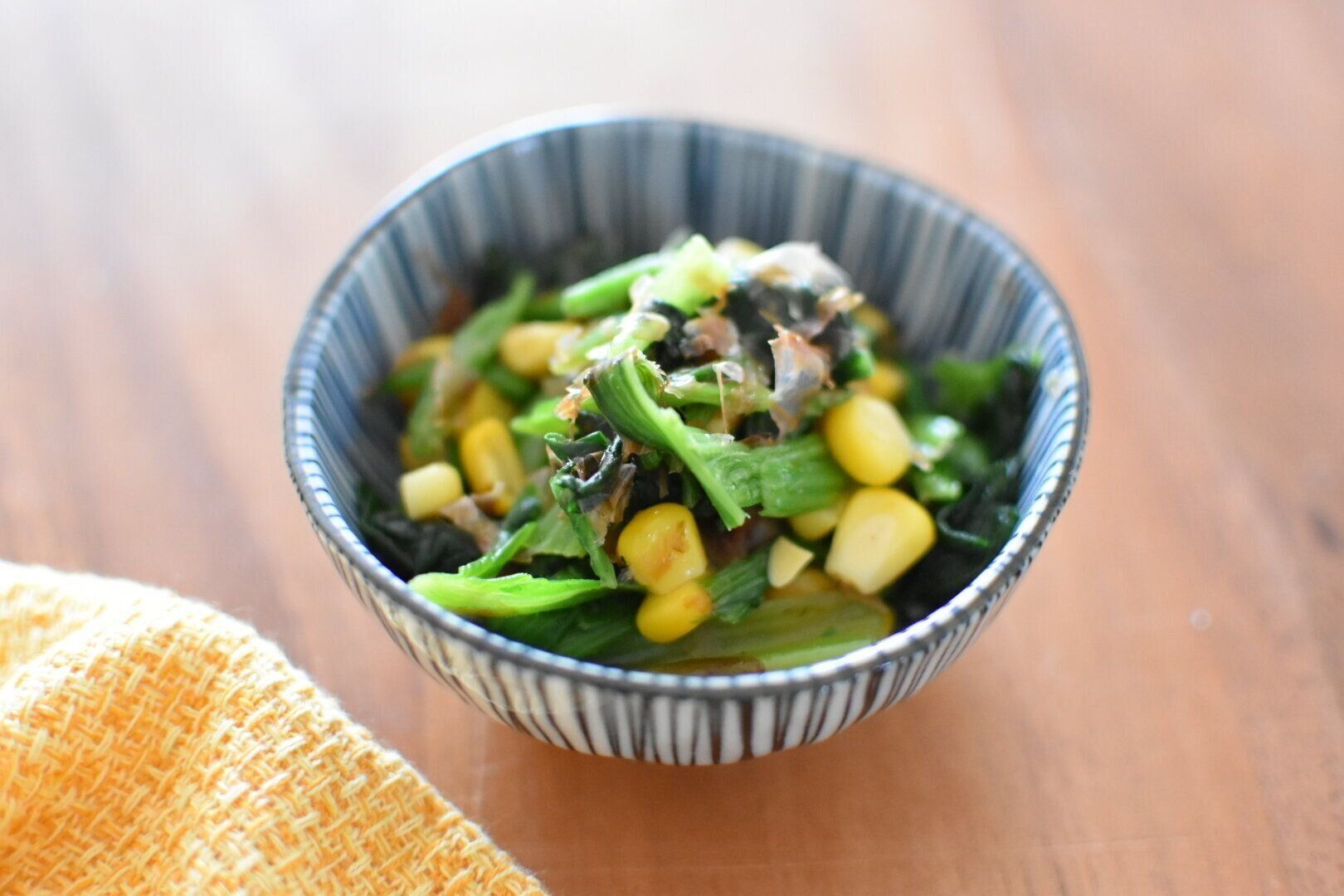 2.ほうれん草が温まったらスイートコーン、めんつゆも加えて和える