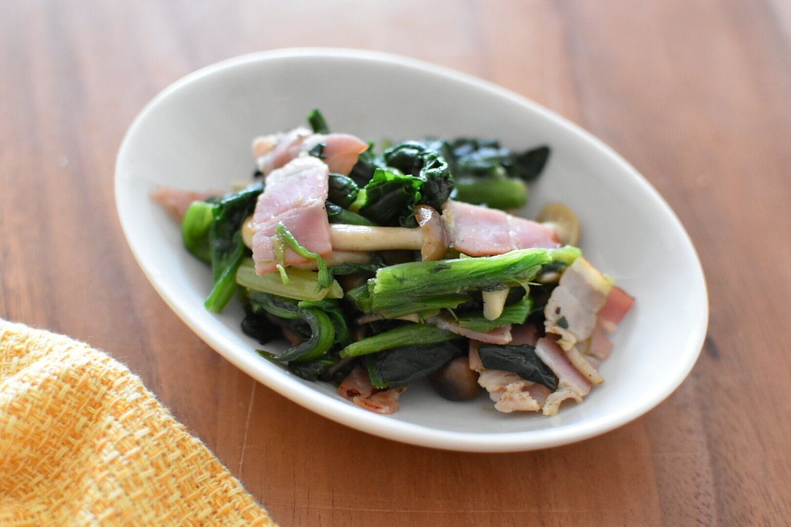 1.フライパンにサラダ油を適量なじまえ、凍ったままのほうれん草と食べやすくカットしたベーコン、しめじを加えてしんなりするまで炒める