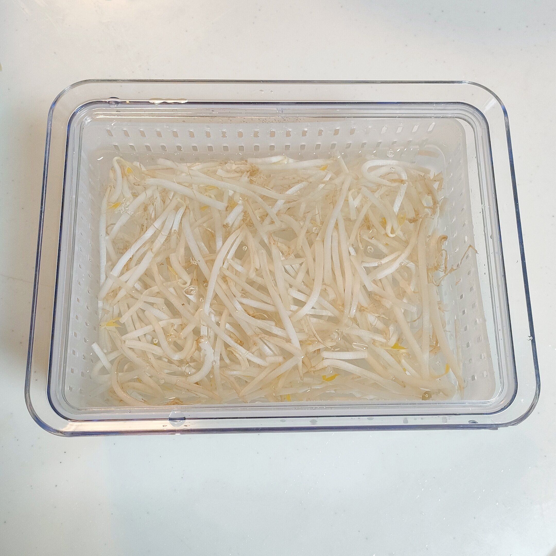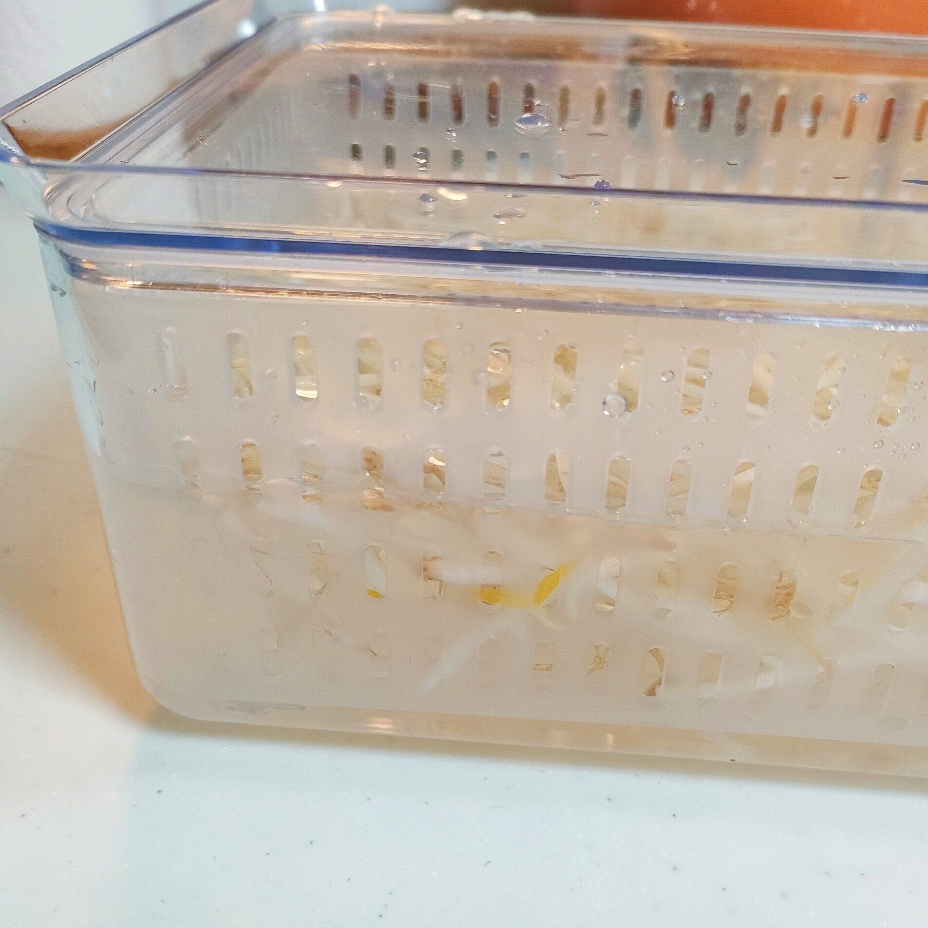 例えば、傷みやすいもやしは水につけておくことで長持ちします。このときに毎日水を変えますが、容器がクリアなので中が見えるというのもありがたい!
