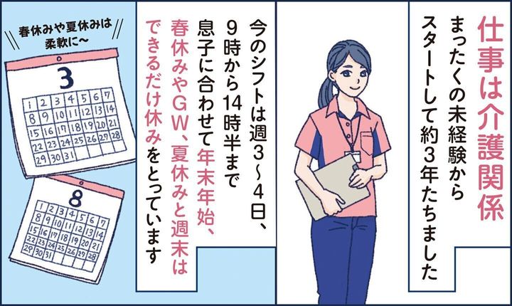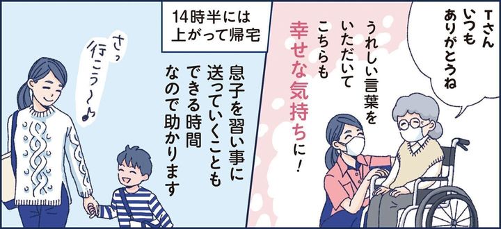 育児や介護と両立しながら働きたい方など、たくさんの方に働いていただけるように、お手伝いしています。例えば、「子どもが休みのときは自分もお休みしたい」、「子どもの習い事が入ったので、就業時間を短くしたい」などの希望にもできるだけ応じます。