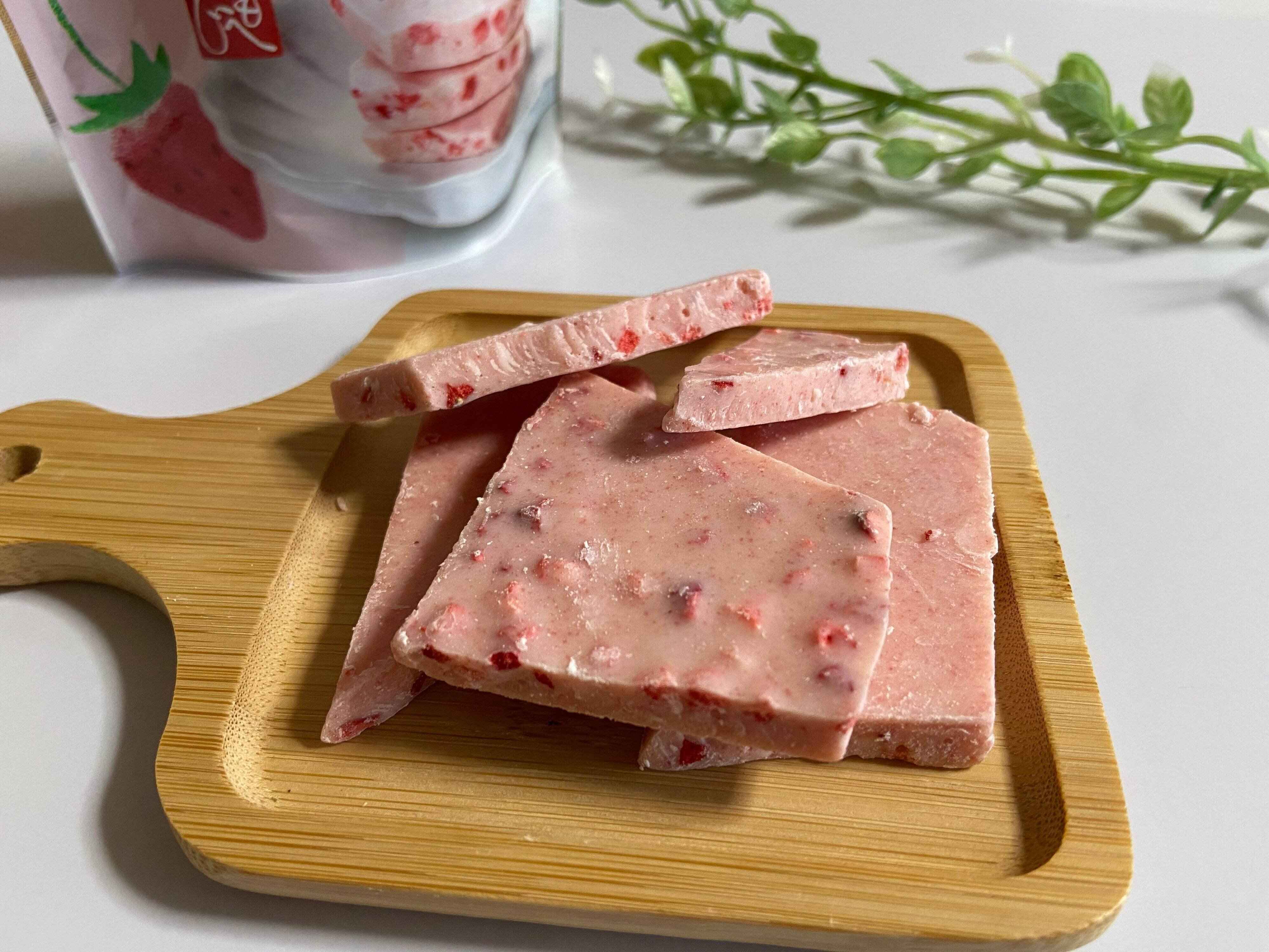 ホワイトチョコベースのいちごチョコレートにドライいちごがたっぷり入った、割れチョコスタイル。