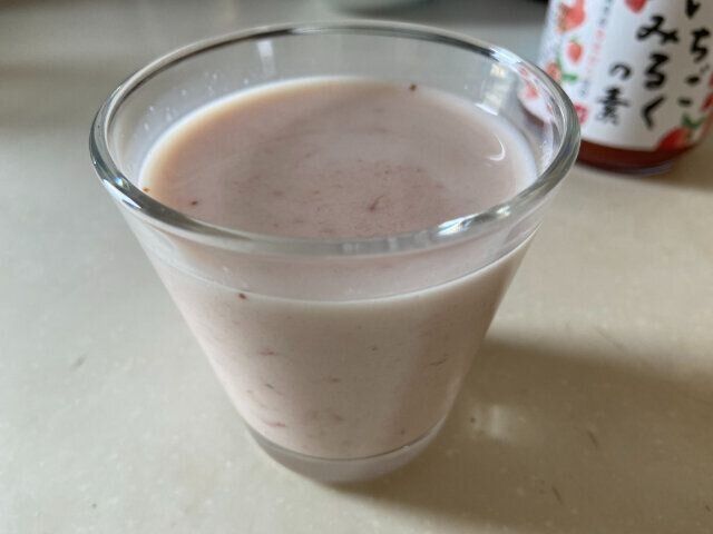牛乳で割って飲んでみると、いちごの果肉がたっぷりと入ってフルーティーで昔懐かしいいちごみるく!
