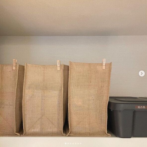 何かを入れてバッグとして持ち運ぶだけでなく、収納にも活用できるのが無印良品のジュートバッグ。とてもシンプルなデザインなのでインテリアの邪魔をせず、シンプルにものを収納することができます。クリップに中身を書いてつけておくのはよいアイデアですね。